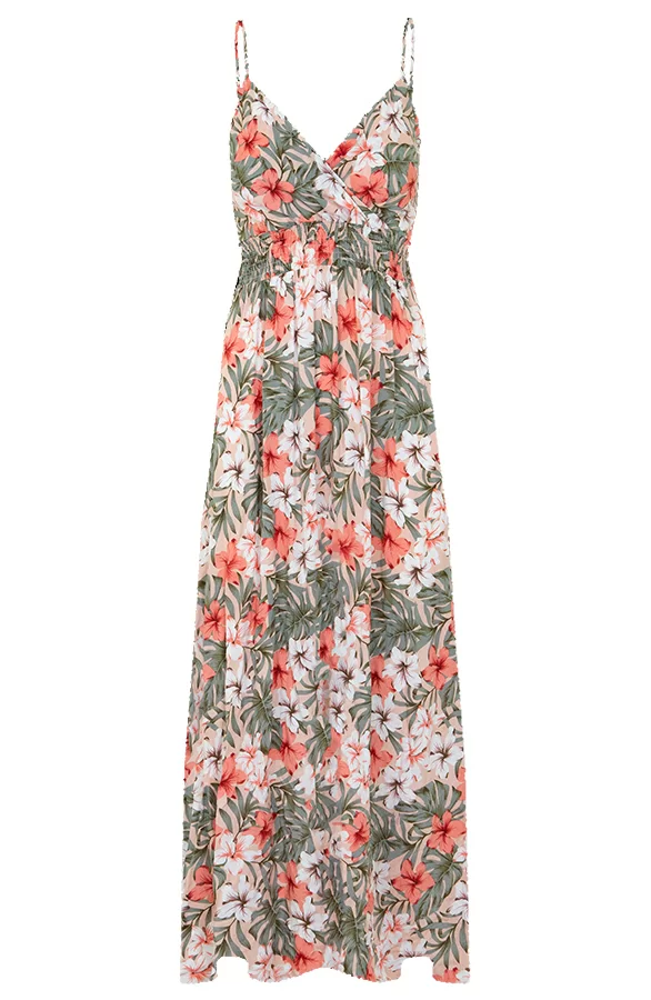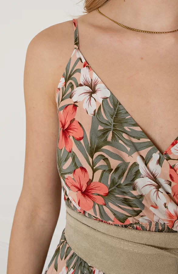 Details: v-hals, bloemenprint, elastiek in de taille en verstelbare spaghettibandjes Materialen: 65% Viscose, 35% Katoen