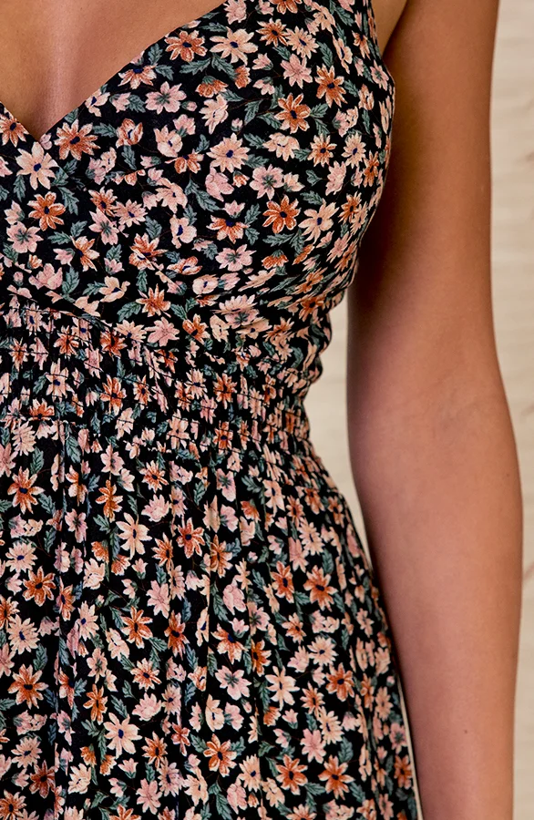 Details: v-hals, bloemenprint, elastiek in de taille en verstelbare spaghettibandjes Materialen: 65% Viscose, 35% Katoen