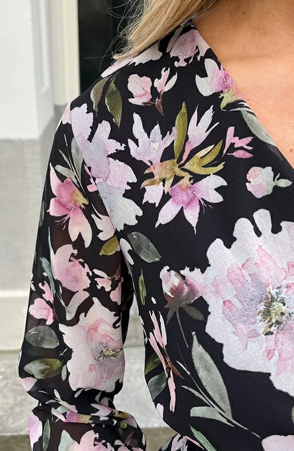 Details: v-hals, lange mouwen, ruches, onderjurk, bloemenprint, elastiek in de taille en elastiek bij de mouwen Materialen: 5% Elastaan, 95% Polyester