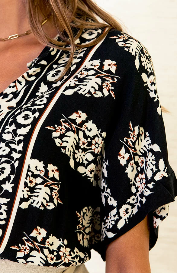 Details: v-hals, korte mouwen, lint om te strikken, knoopsluiting en bloemenprint Materiaal: 100% Viscose