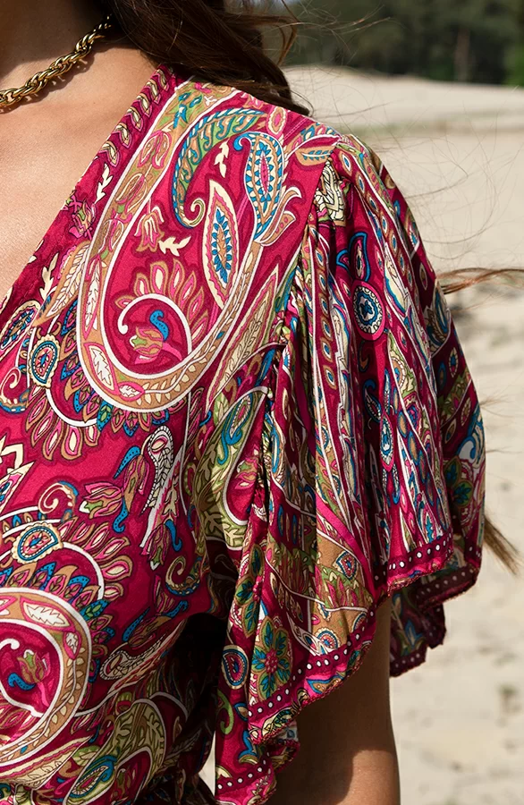 Details: riemlussen, v-hals, vleermuismouwen, bijpassend ceintuur in de taille en elastiek in de taille Materiaal: 100% Viscose