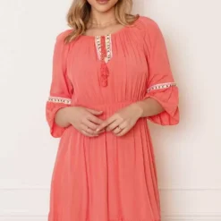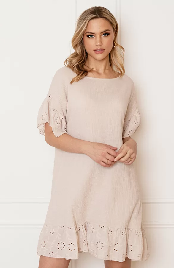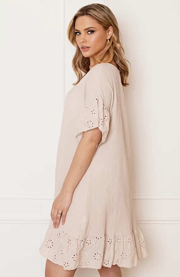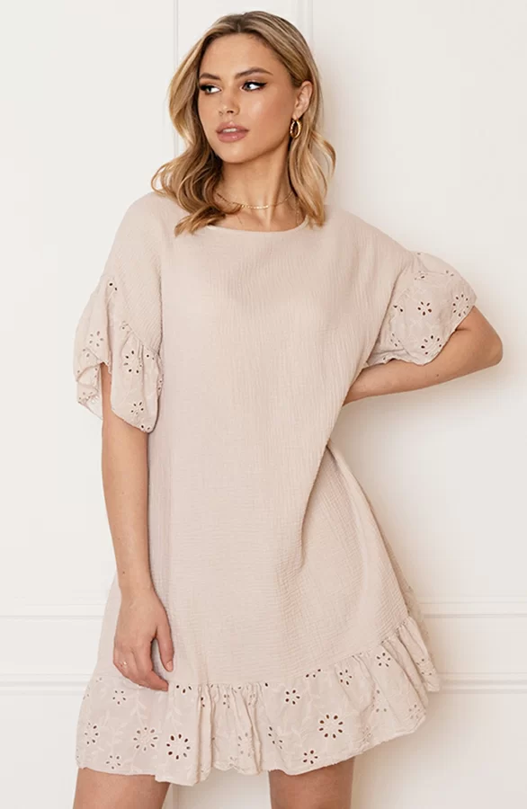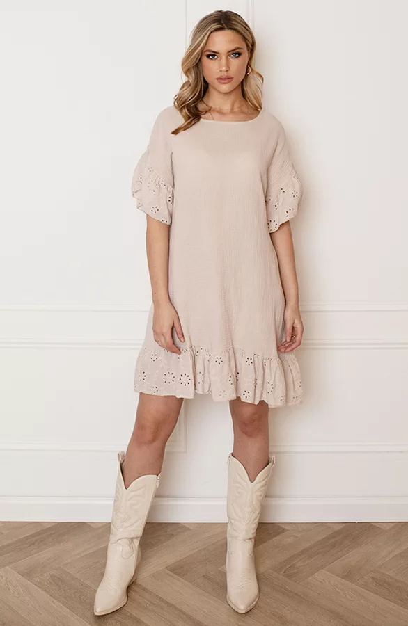 Dit jurkje is perfect voor het komende seizoen! De jurk is voorzien van korte mouwen met broderie details.