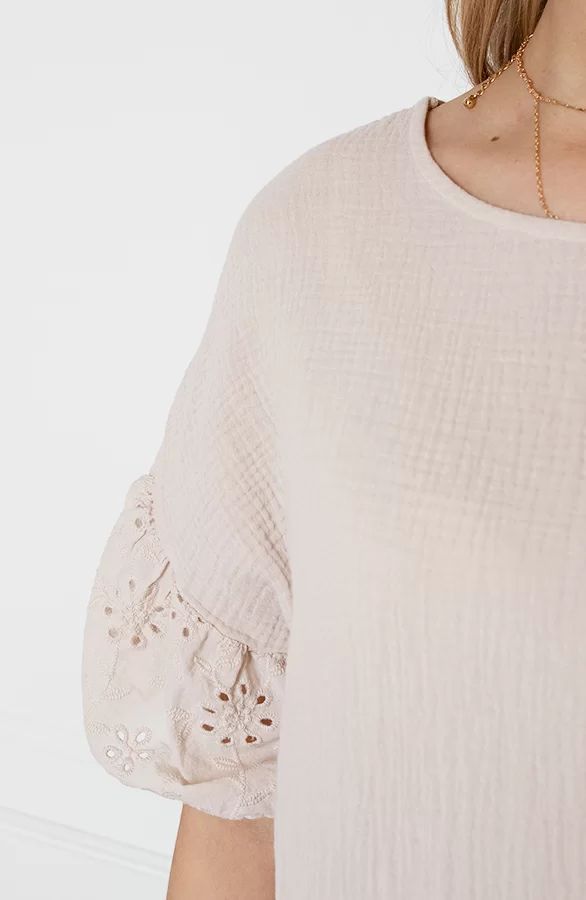 Details: ronde hals, korte mouwen, ruches en broderie Materiaal: 100% Katoen