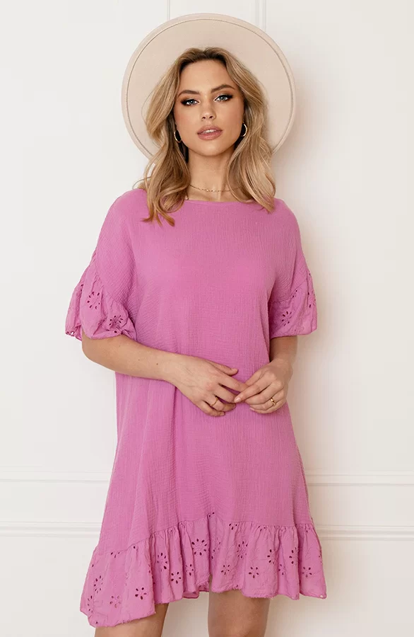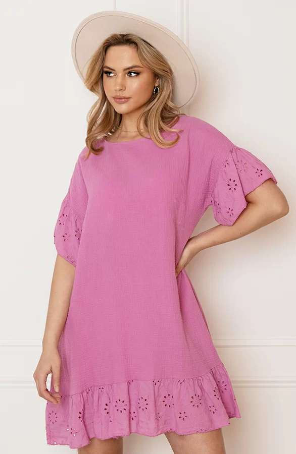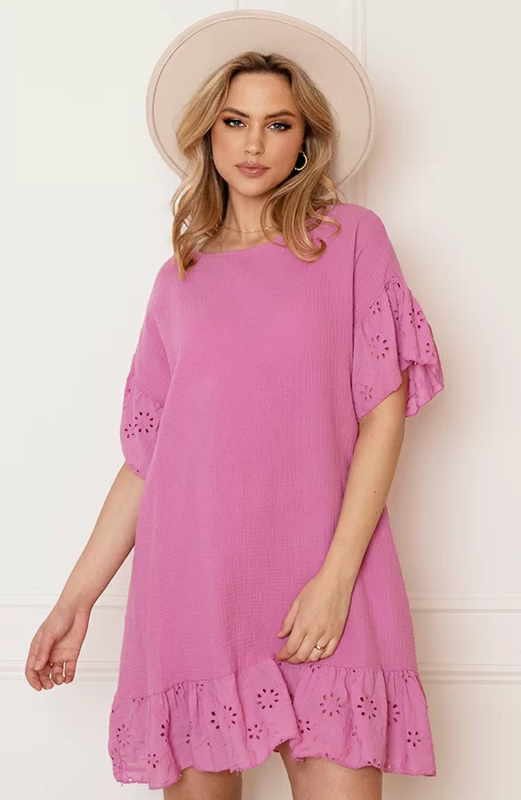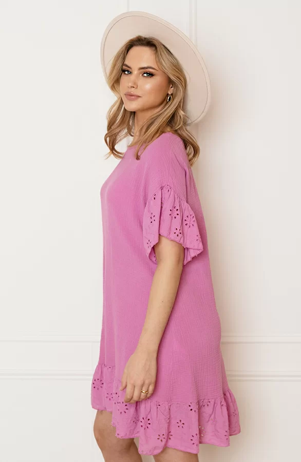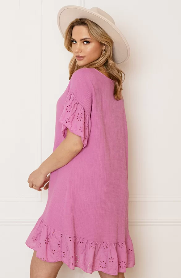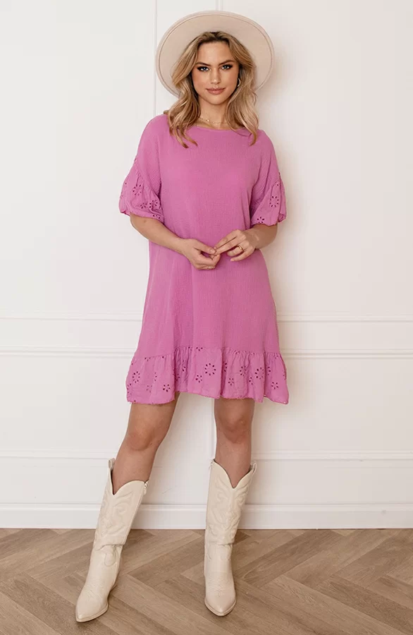 Pink addict! Deze jurk is voorzien van broderie op de mouwen en is verkrijgbaar in meerdere kleuren.