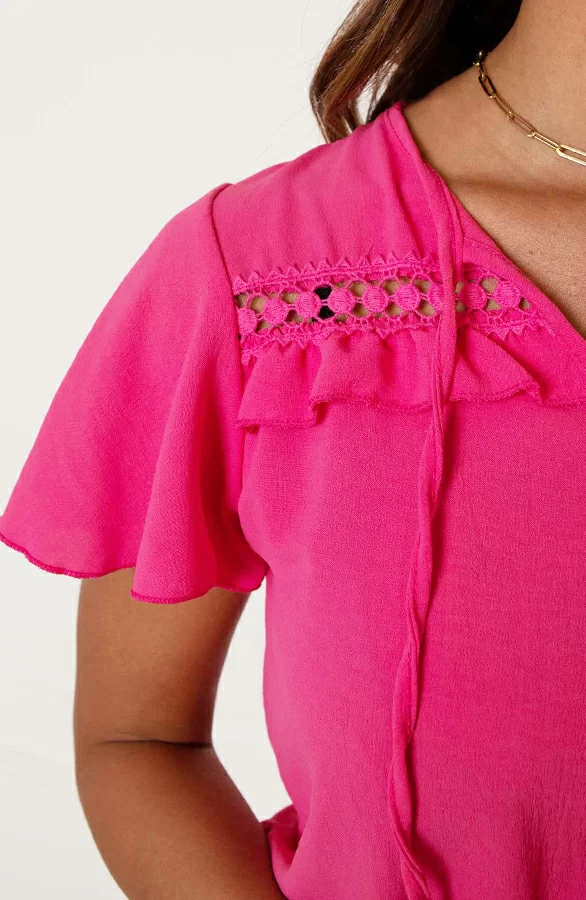 Details: v-hals, korte mouwen, ruches, vleermuismouwen en elastiek in de taille Materiaal: 100% Polyester