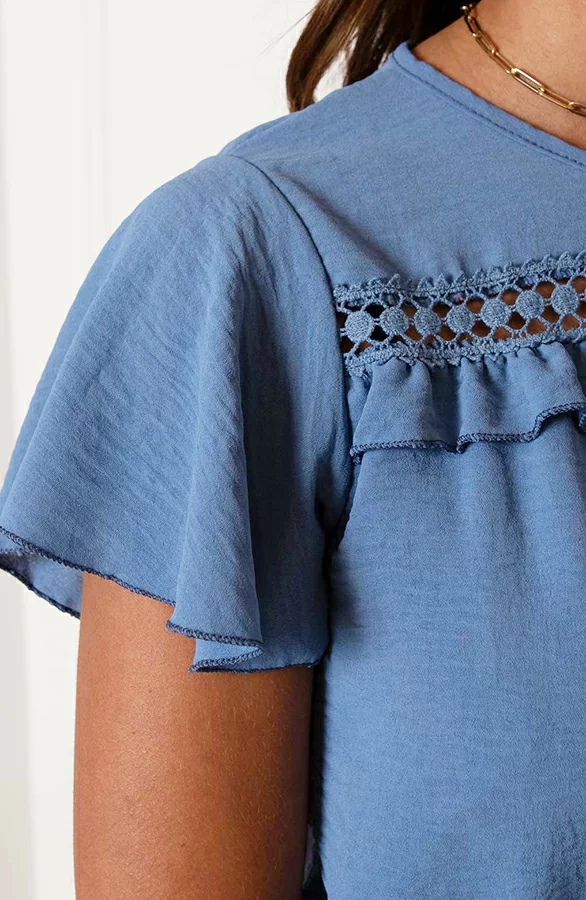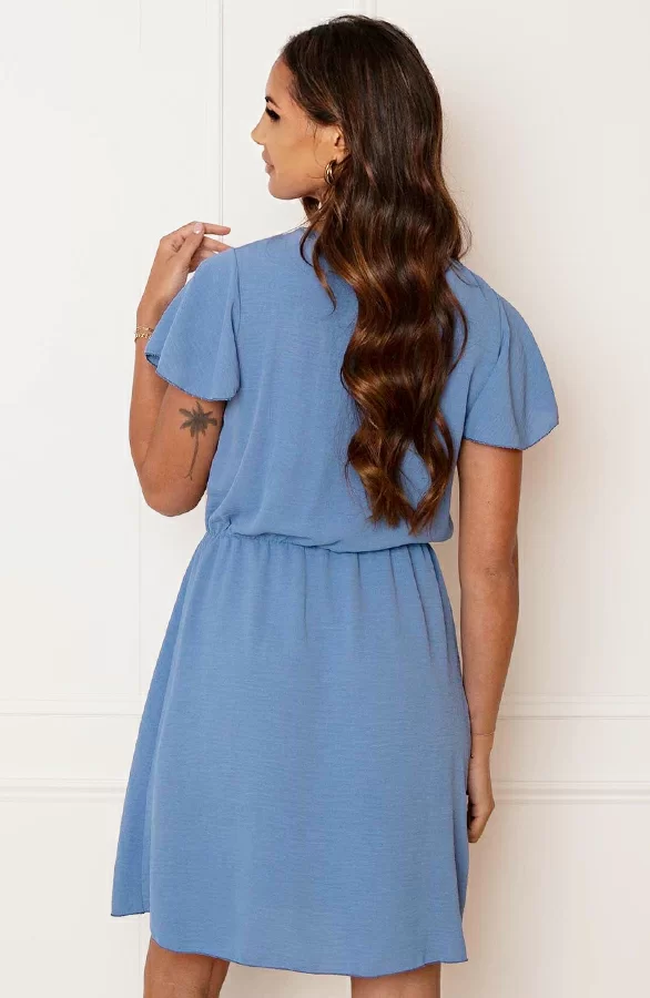 Details: v-hals, korte mouwen, ruches, vleermuismouwen en elastiek in de taille Materiaal: 100% Polyester