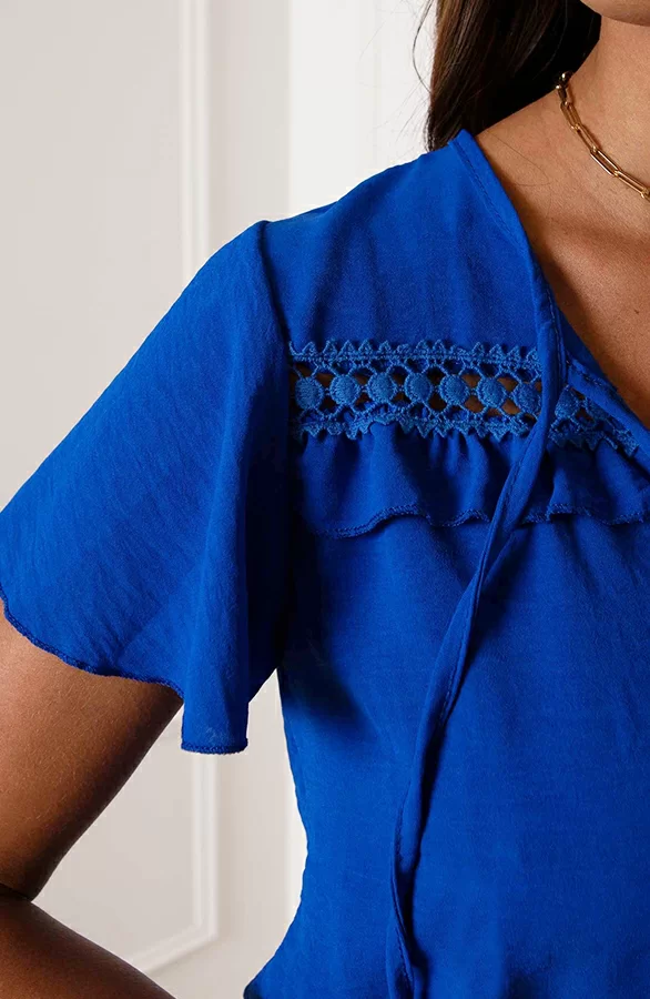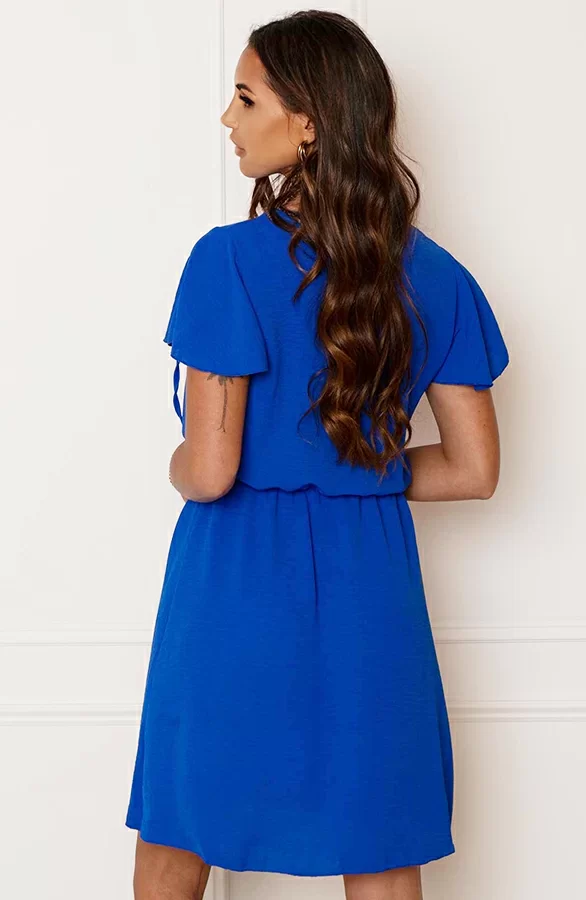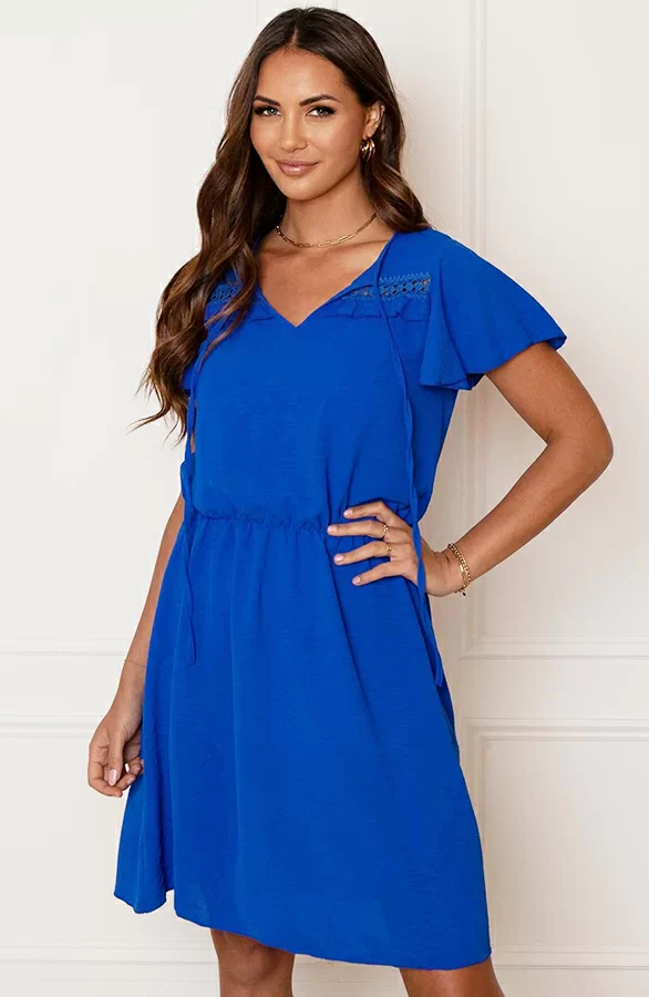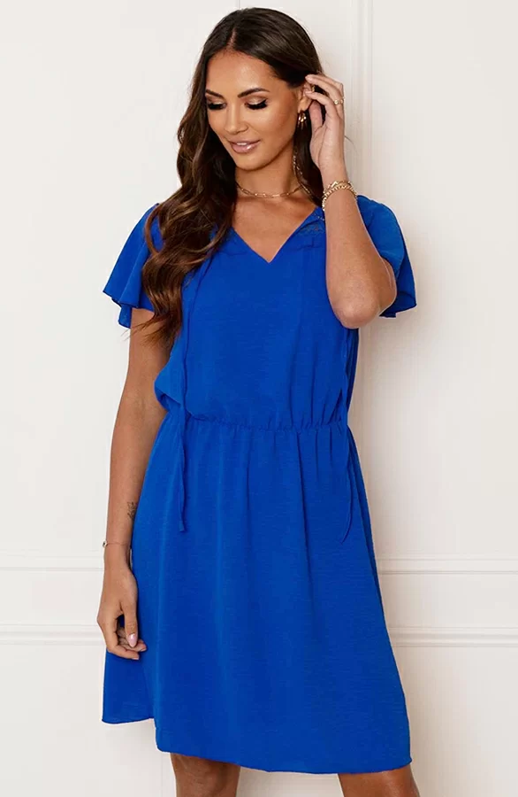 Steel de show met deze té leuke kobaltblauwe jurk! De jurk is voorzien van ruches en een touwtje om te strikken.