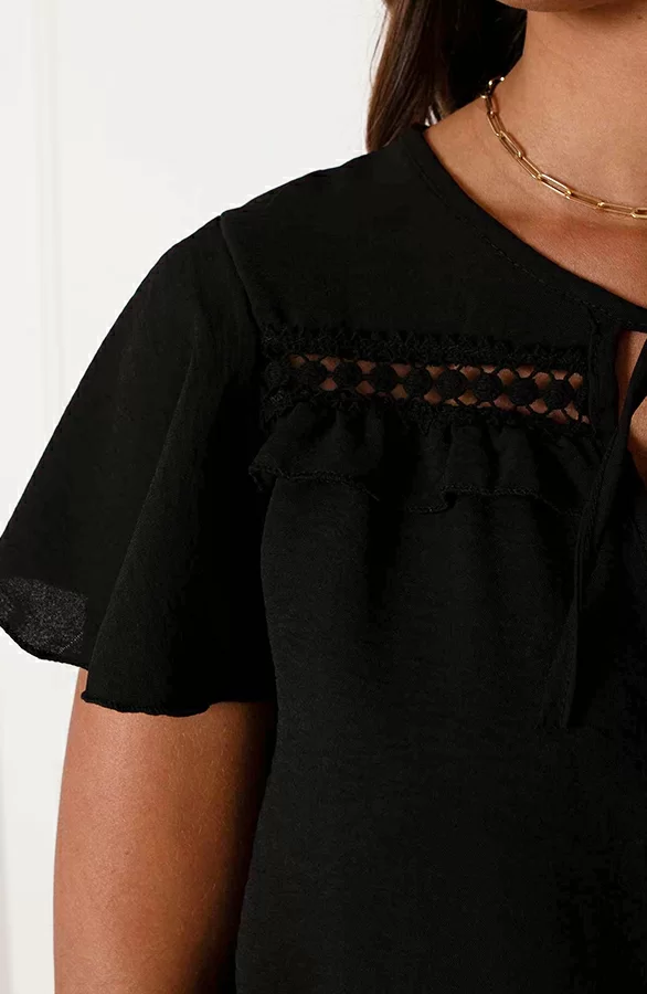 Details: v-hals, korte mouwen, ruches, vleermuismouwen en elastiek in de taille Materiaal: 100% Polyester