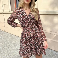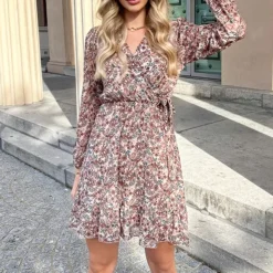 Details: v-hals, lange mouwen, ruches, lint om te strikken, onderjurk, elastiek in de taille en elastiek bij de mouwen Materialen: 48% Viscose, 2% Elastaan, 50% Polyester