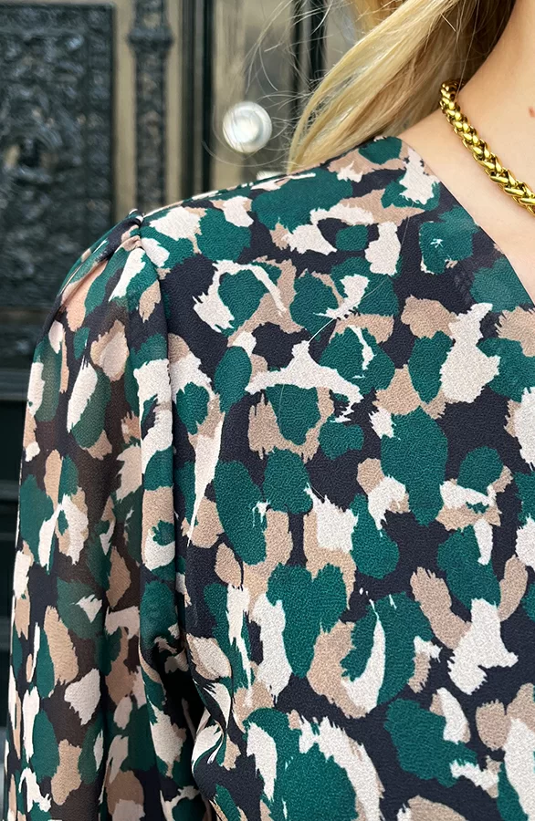 Details: v-hals, lange mouwen, ruches, lint om te strikken, onderjurk, elastiek in de taille en elastiek bij de mouwen Materialen: 48% Viscose, 50% Polyester, 2% Elastaan