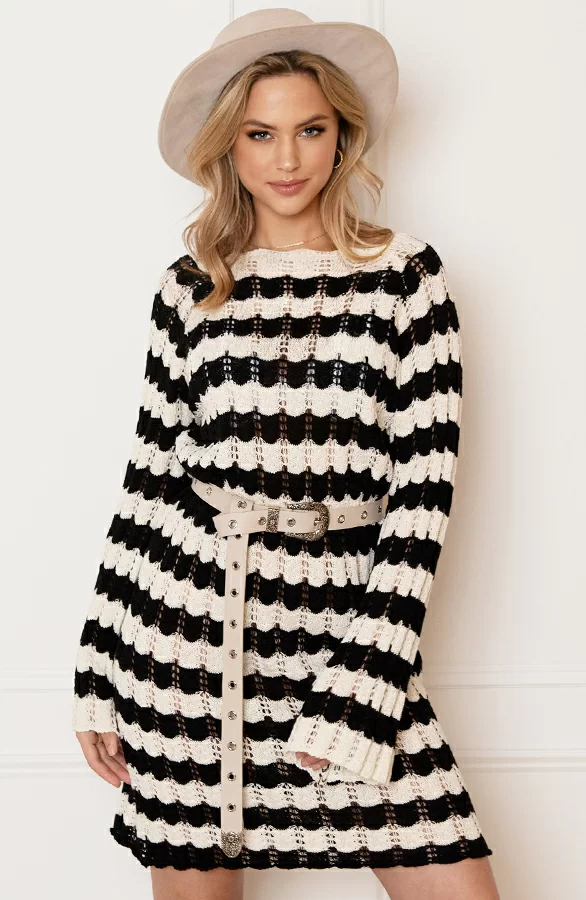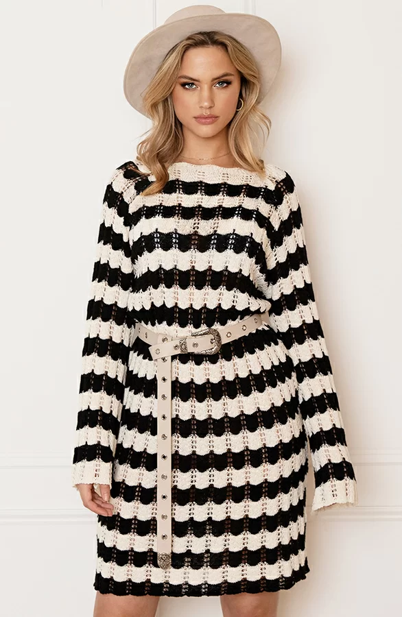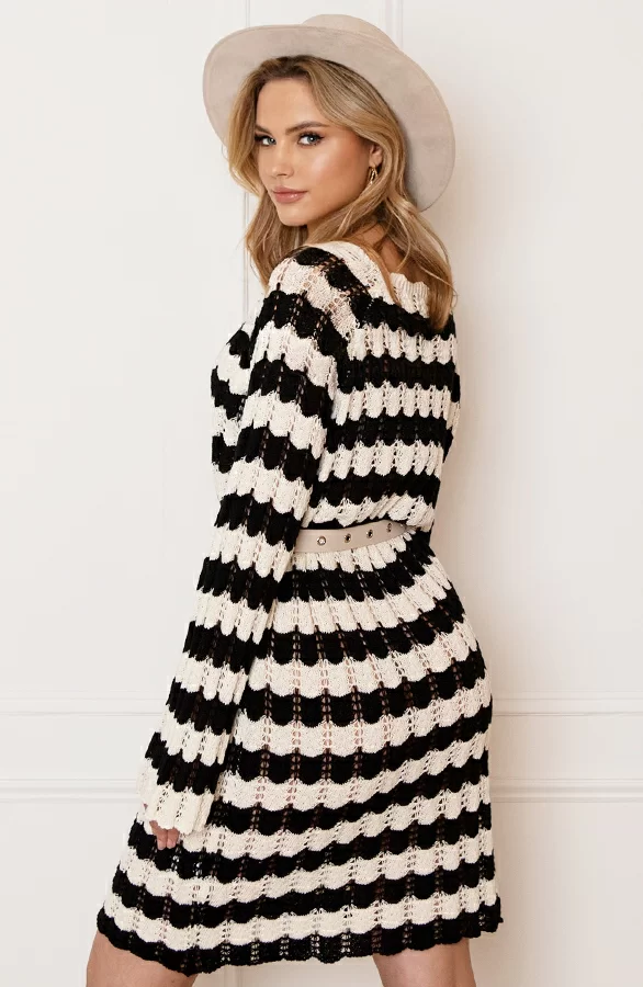 Dit jurkje is de trend op dit moment! De gehaakte jurk is voorzien van een gestreept patroon en een ronde hals.