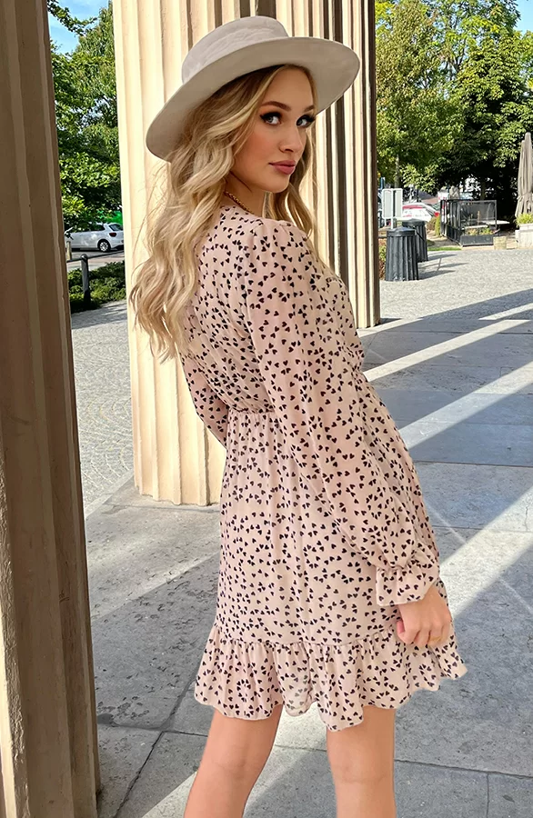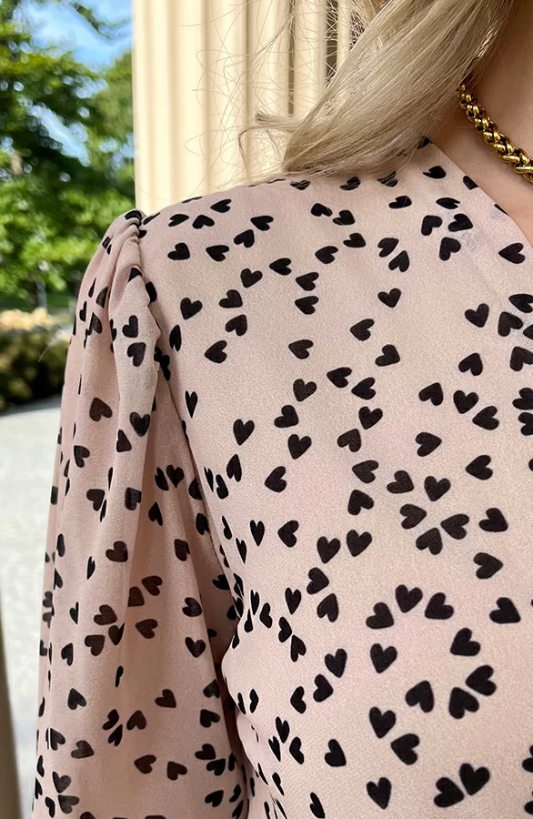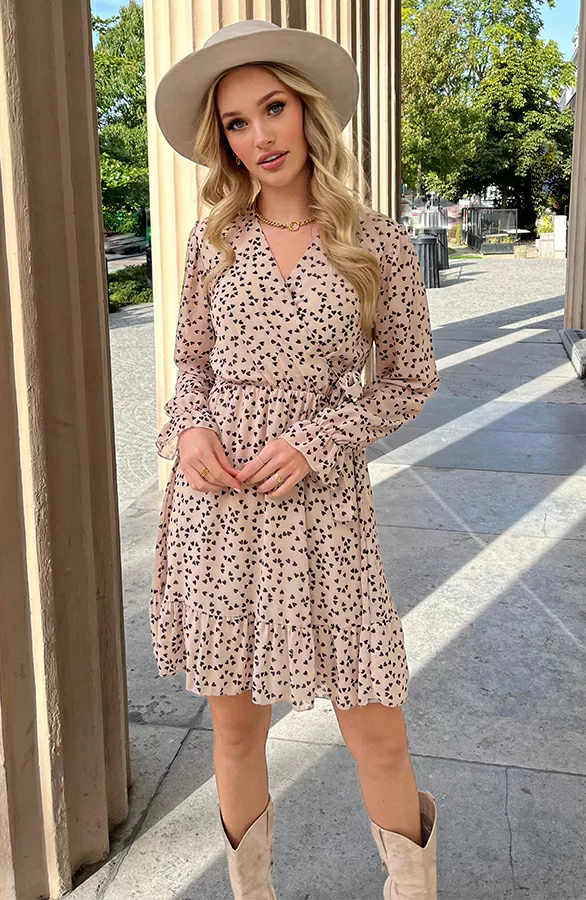 Details: v-hals, lange mouwen, ruches, lint om te strikken, onderjurk, elastiek in de taille en elastiek bij de mouwen Materialen: 48% Viscose, 50% Polyester, 2% Elastaan