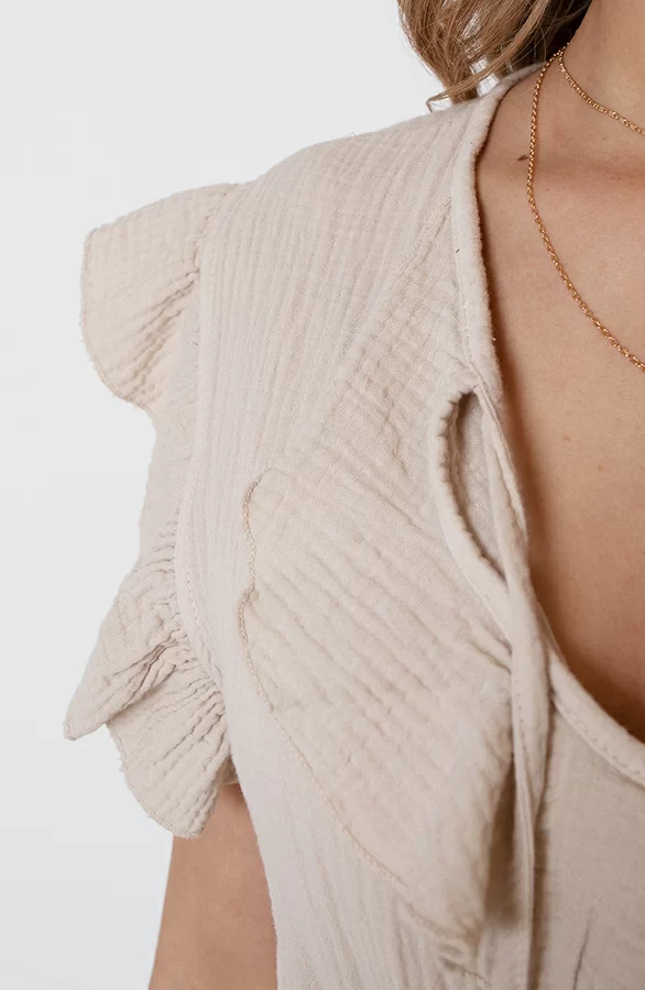 Details: korte mouwen, ruches, lint om te strikken, verschillende laagjes en elastiek in de taille Materiaal: 100% Katoen