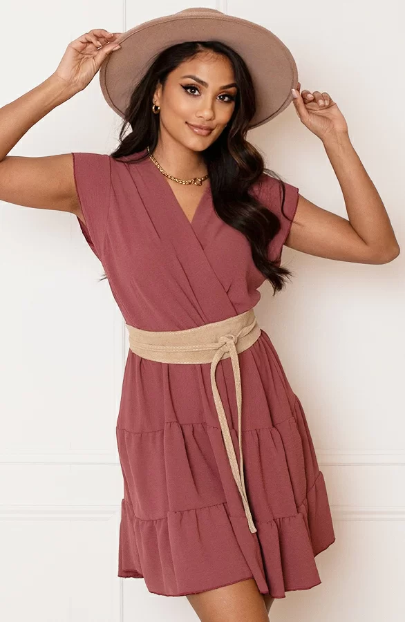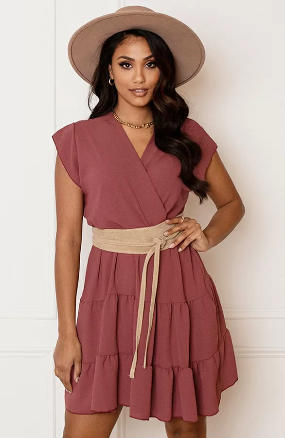Roze is altijd een goed idee! Deze geweldige laagjes jurk is voorzien van een bijpassend lint om te strikken en een v-hals.