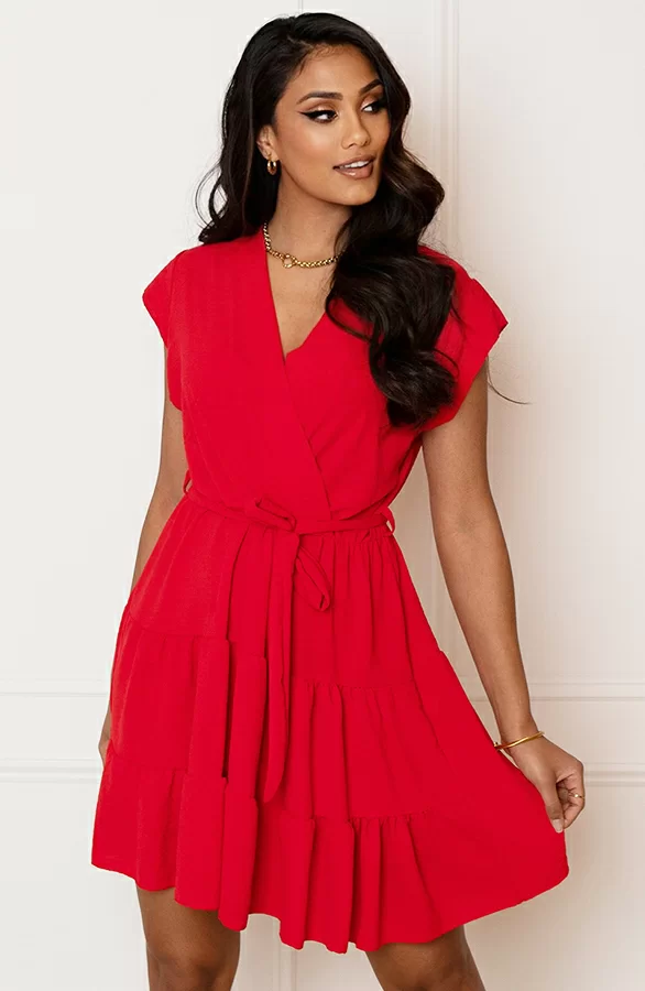 PRETTY lady in red! Met deze geweldige jurk mag jij gezien worden! De jurk is voorzien van een v-hals en lint om te strikken.