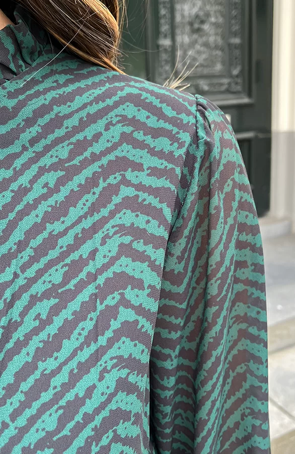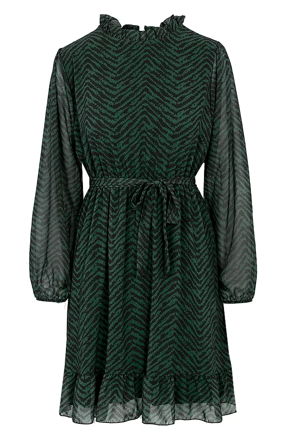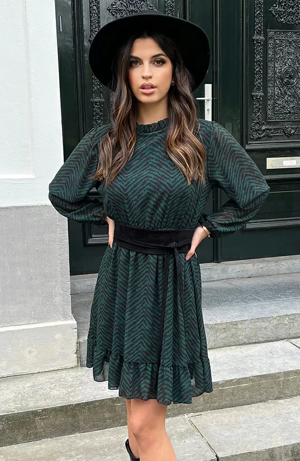 Details: lange mouwen, ruches, onderjurk, colkraag, bijpassend ceintuur in de taille, elastiek in de taille, knoopje in nek en elastiek bij de mouwen Materialen: 48% Viscose, 50% Polyester, 3% Elastaan