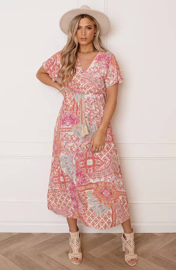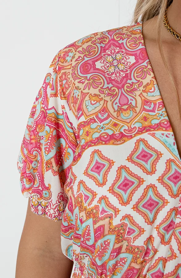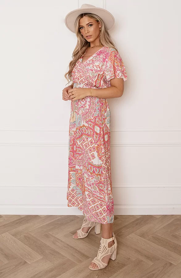 Wij kunnen geen genoeg krijgen van print jurkjes! Deze jurk is voorzien van elastiek in de taille, korte mouwen en een v-hals.