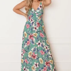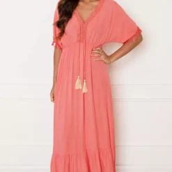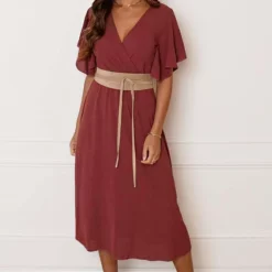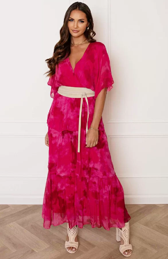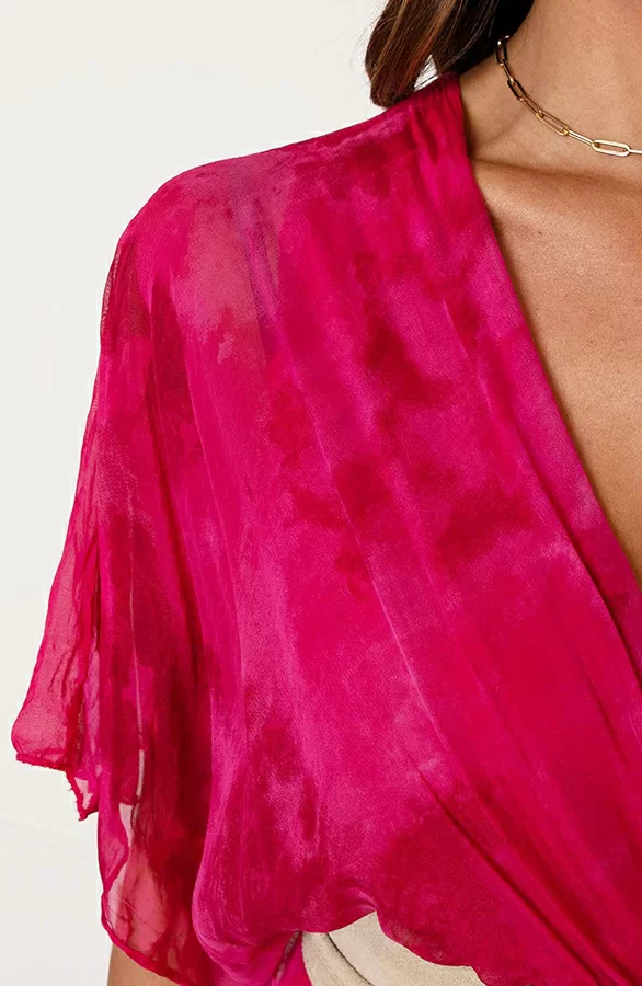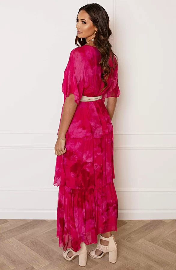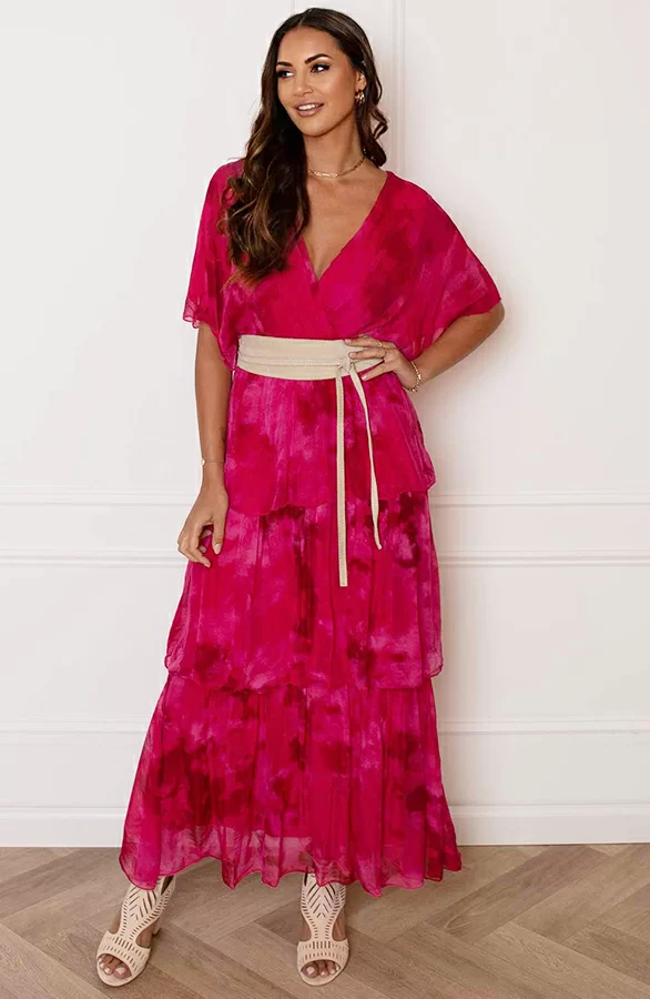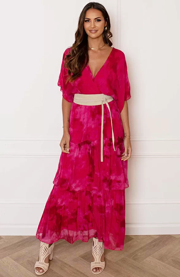 Details: v-hals, korte mouwen, lint om te strikken, vleermuismouwen, verschillende laagjes, onderjurk en elastiek in de taille Materialen: 25% Zijde, 75% Viscose