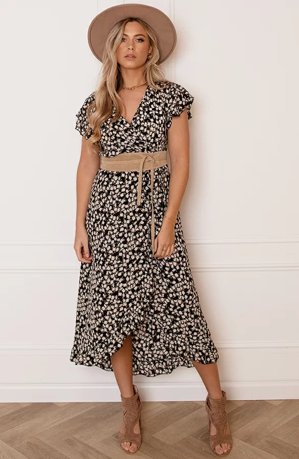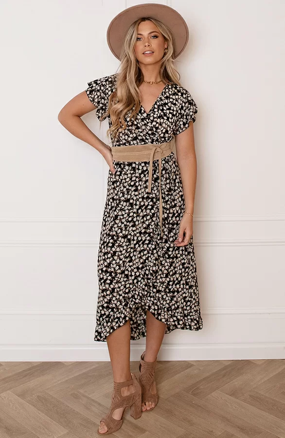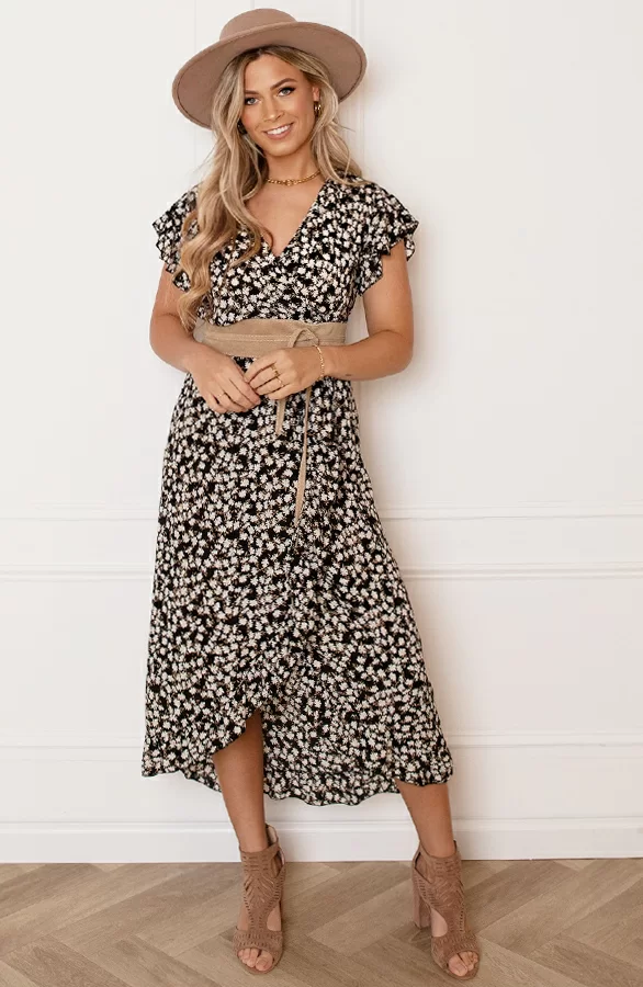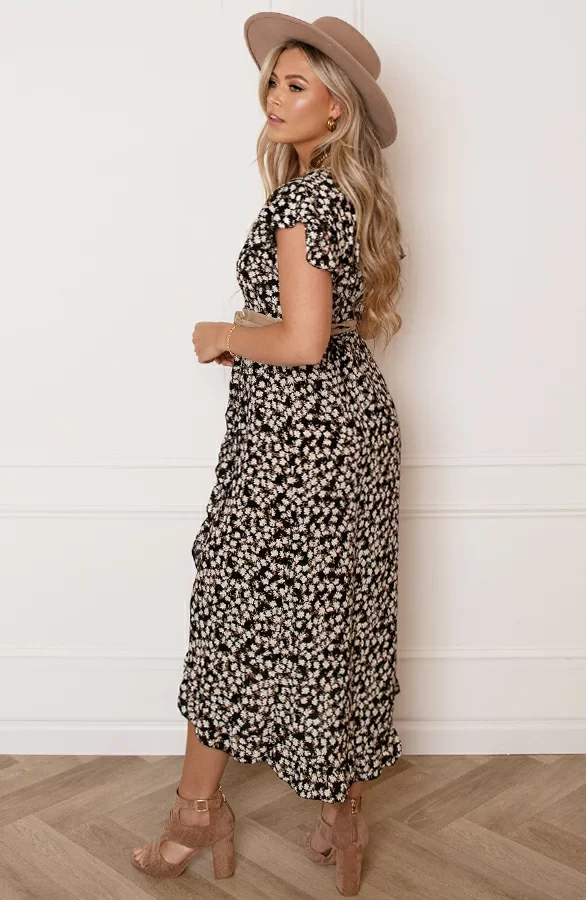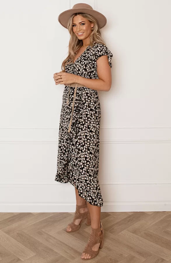 Pretty! Hoe leuk is deze jurk met bloemenprint?! De jurk is voorzien van een v-hals, een lint om te strikken en ruches.