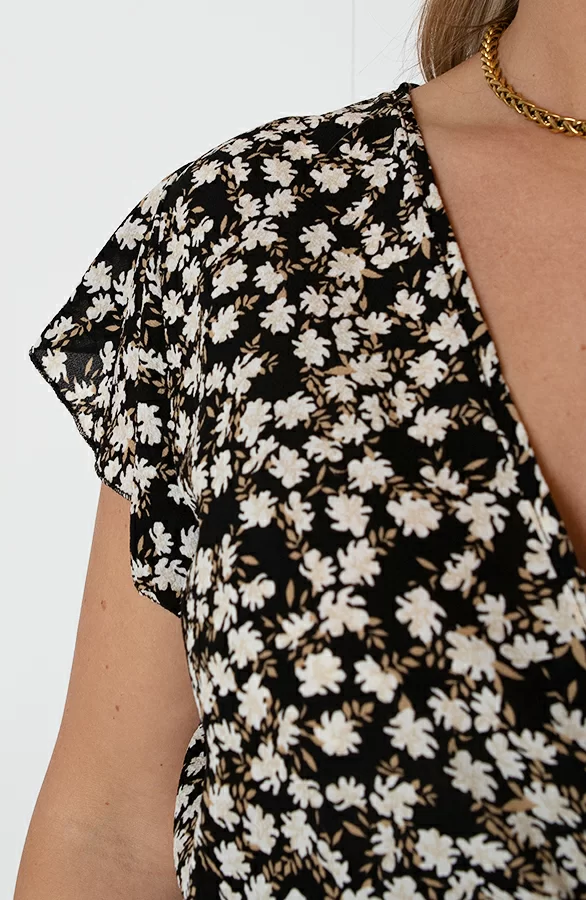 Details: v-hals, ruches, lint om te strikken, overslag en bloemenprint Materiaal: 100% Polyester