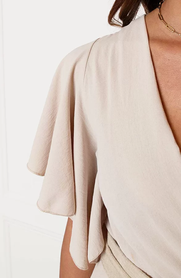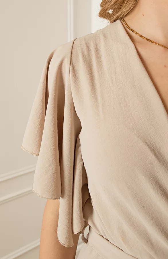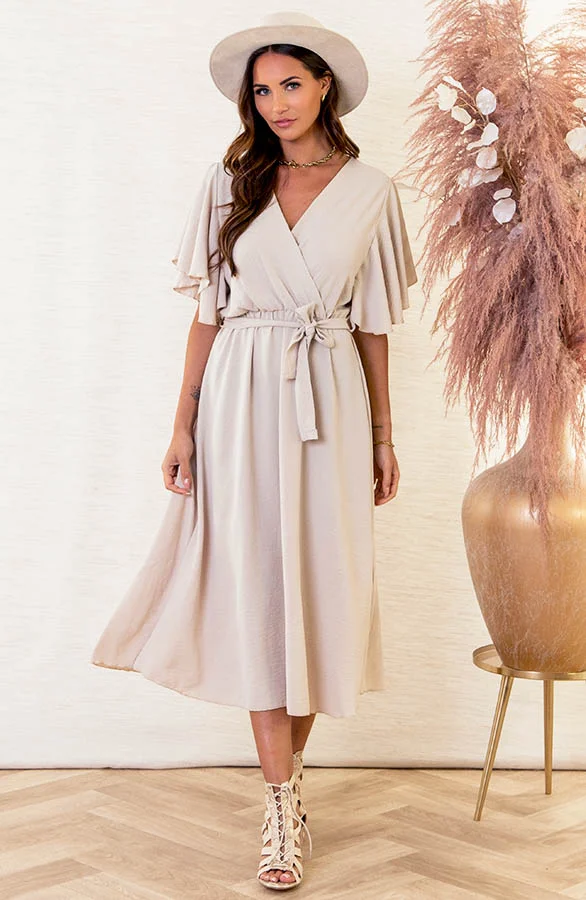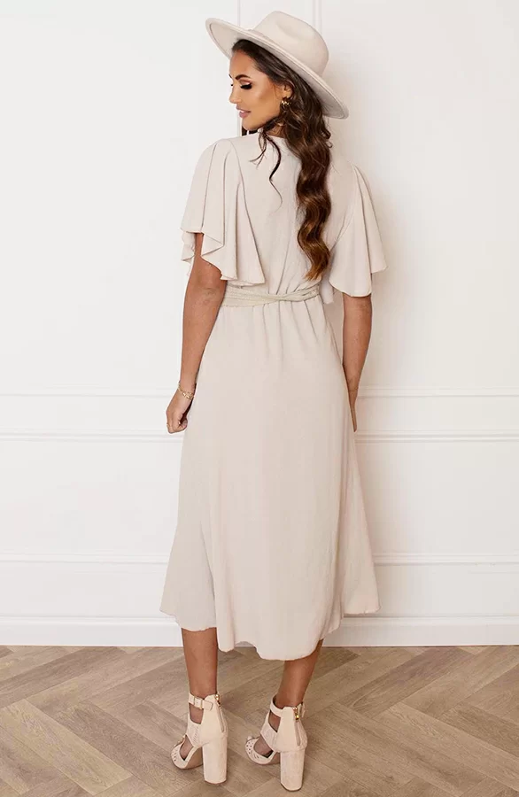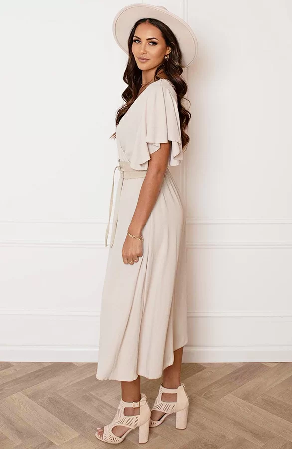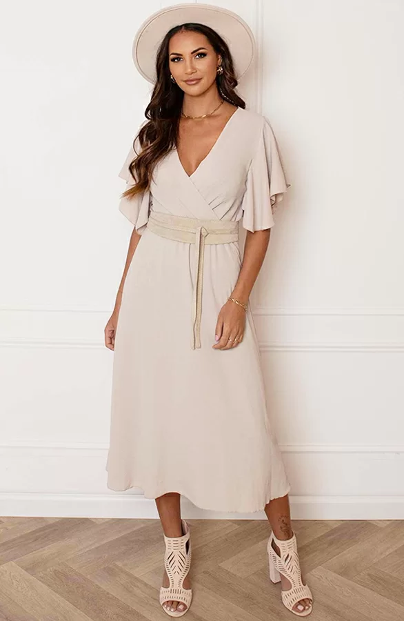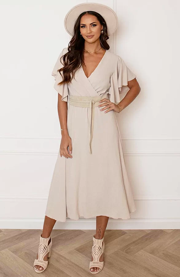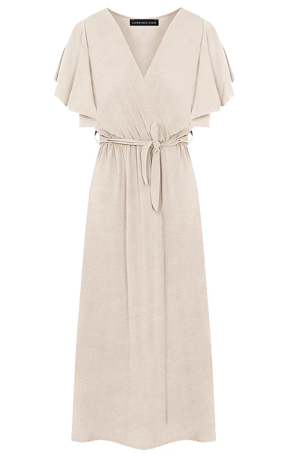 Deze beige jurk is perfect voor elke gelegenheid! De jurk is voorzien van een v-hals en bijpassend ceintuur in de taille.