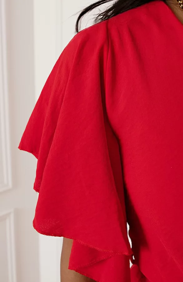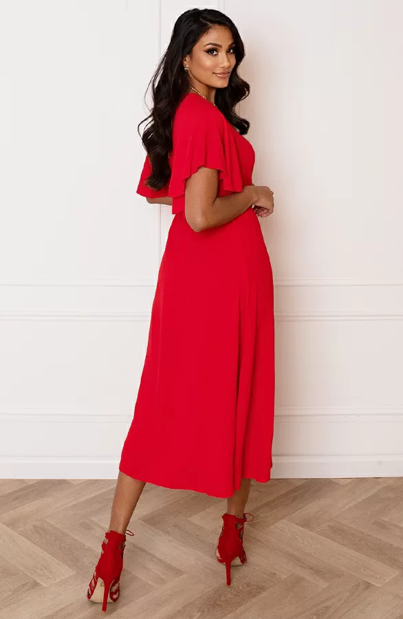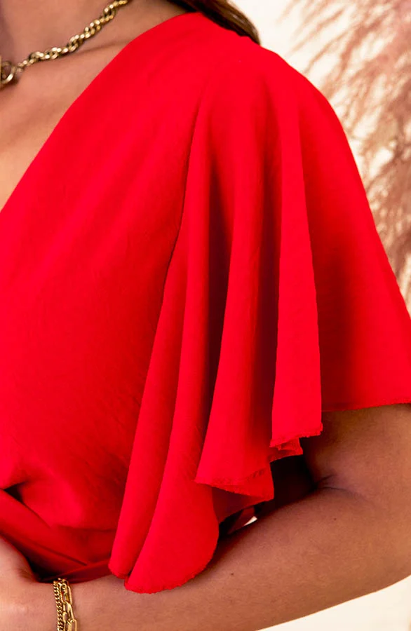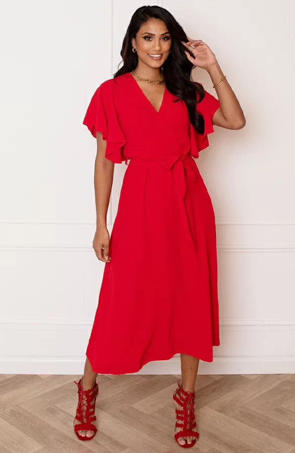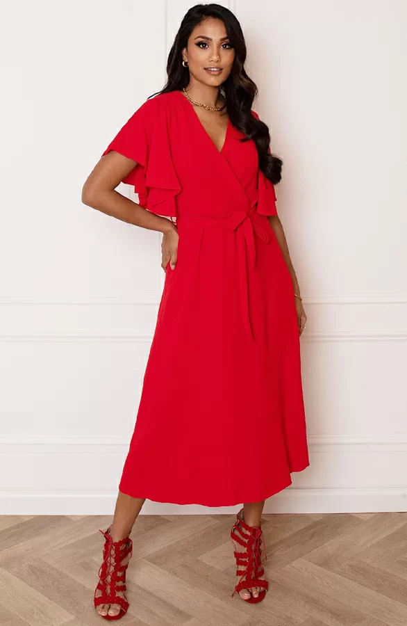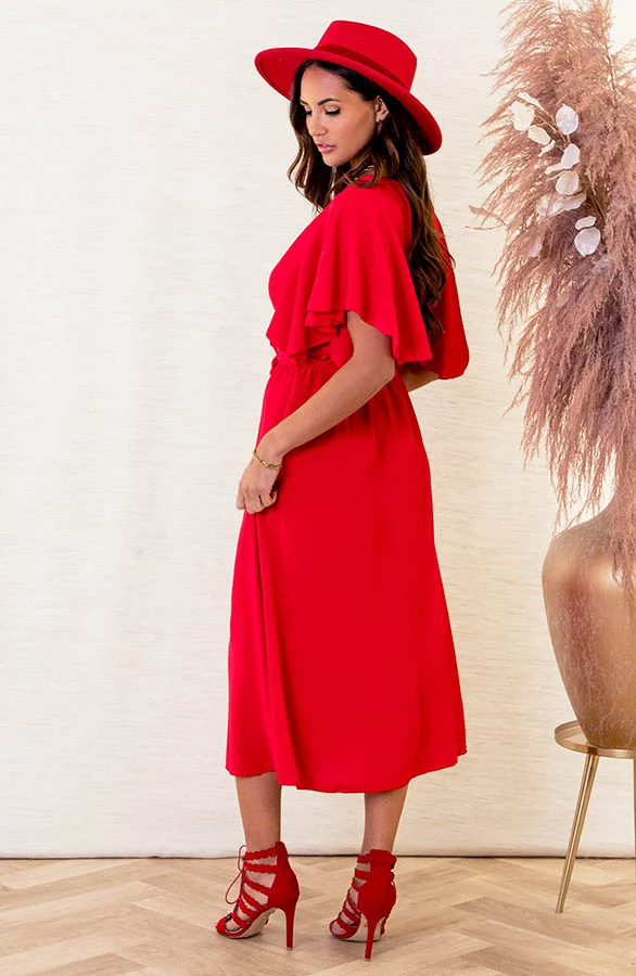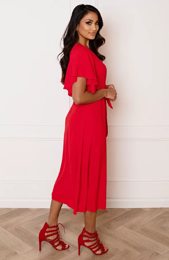 In deze rode jurk mag jij zeker wel gezien worden! De jurk met vleermuismouwen is voorzien van een v-hals en bijpassend lint om te strikken.