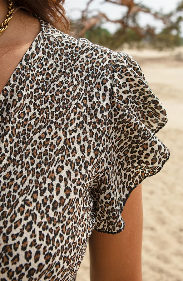 Details: v-hals, ruches, lint om te strikken, overslag en panterprint Materiaal: 100% Polyester