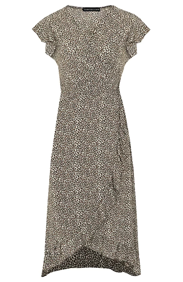 Deze jurk is perfect voor alle panterprint lovers! De overslag jurk is voorzien van een lint om tes trikken en een v-hals.