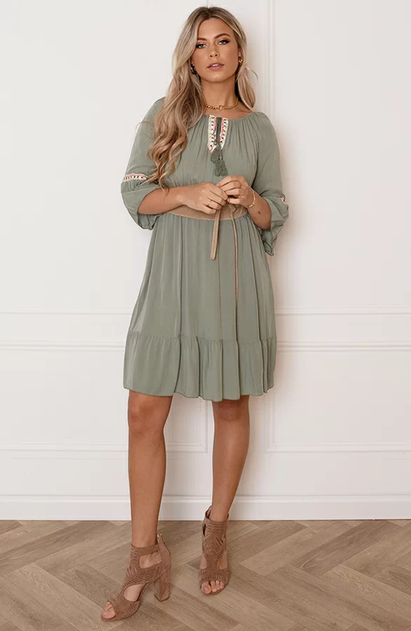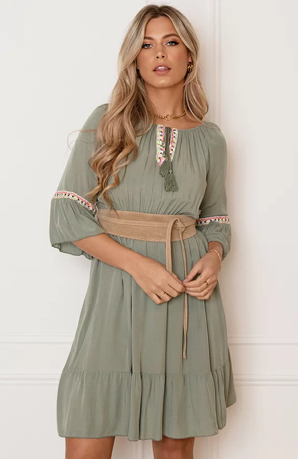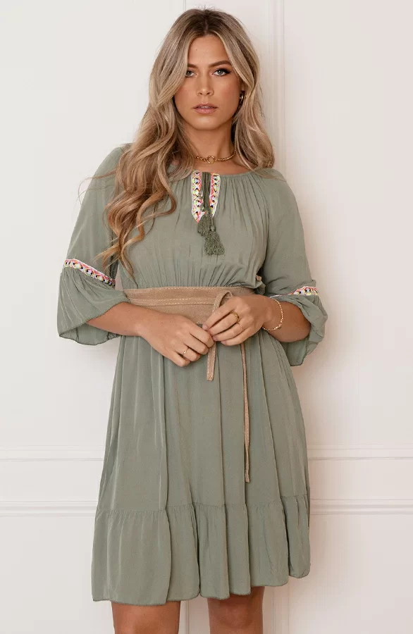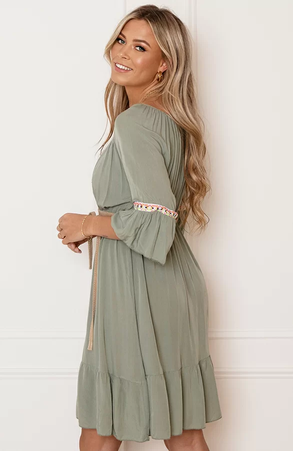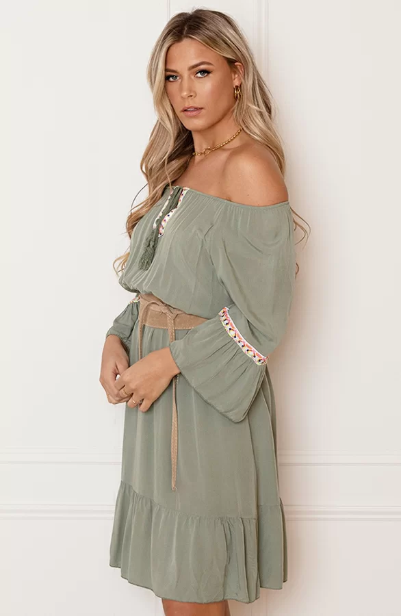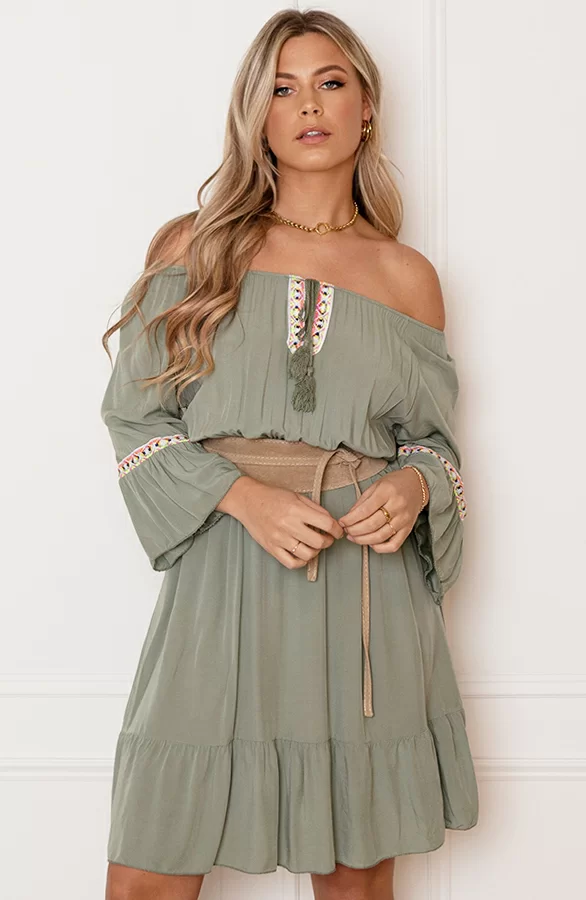 Met deze jurk ben jij straks het stralend middelpunt! De offshoulder jurk is voorzien van flared mouwen en elastiek.