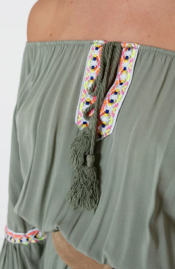 Details: elastiek, offshoulder, flared mouwen, kwastje en driekwart mouwen Materiaal: 100% Viscose