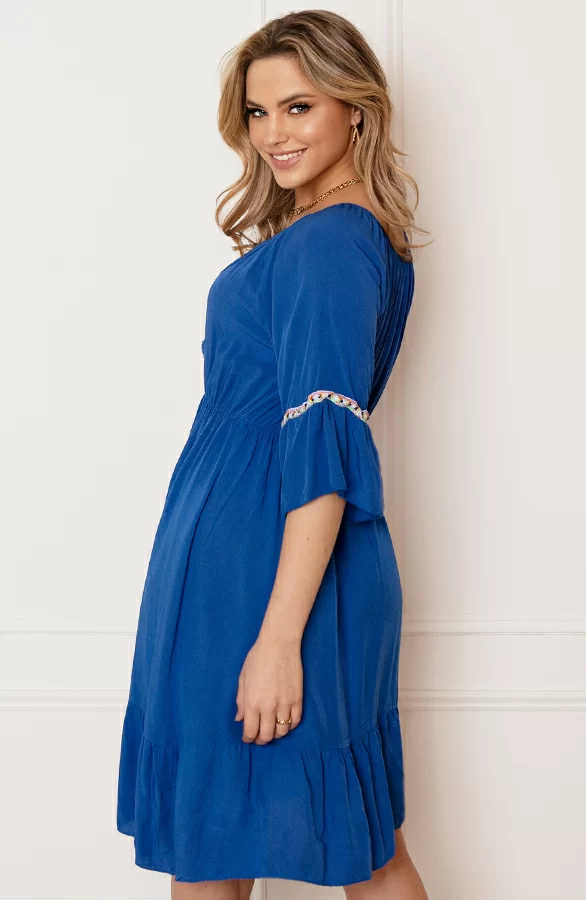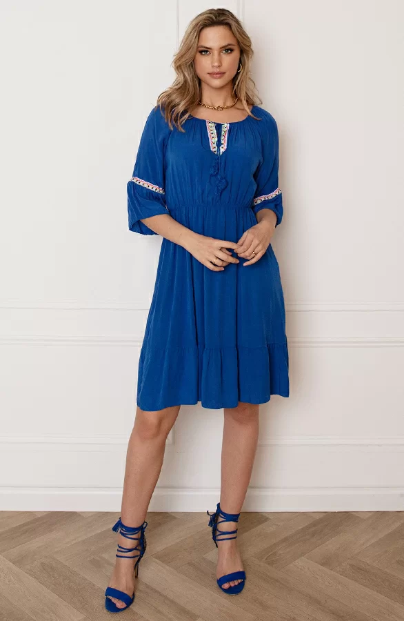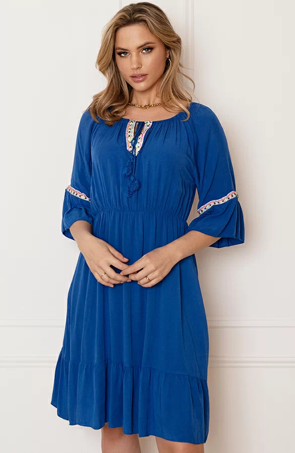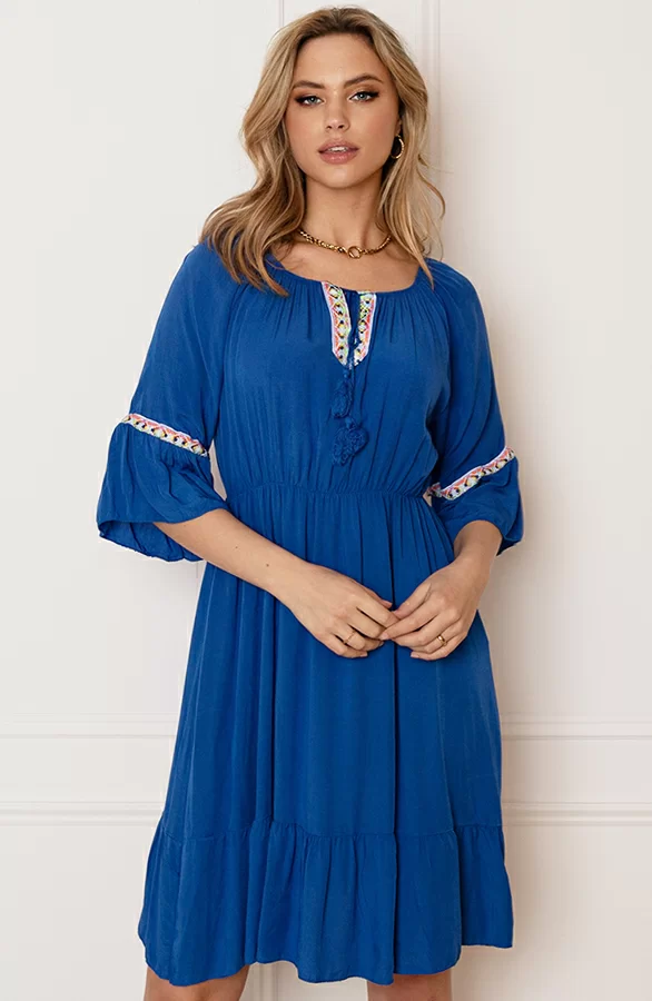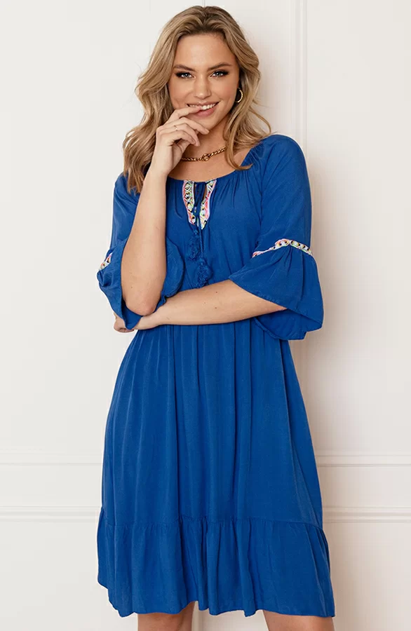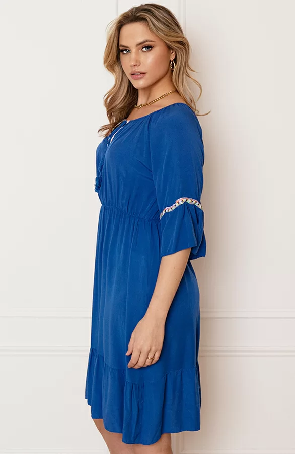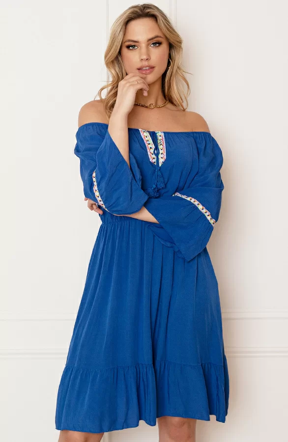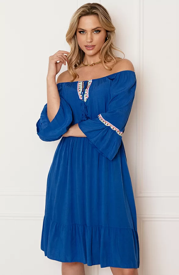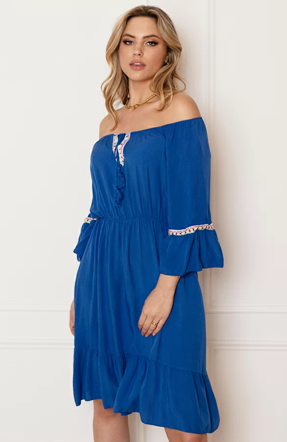 Dit seizoen mag een kobalt jurk niet ontbreken aan jouw garderobe! De offshoulder jurk is voorzien van elastiek en kwastjes.