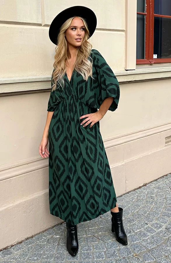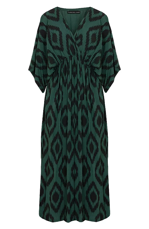 Details: split, v-hals, korte mouwen, vleermuismouwen en elastiek in de taille Materiaal: 100% Viscose