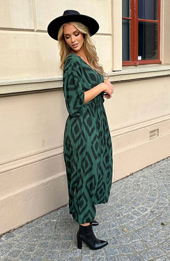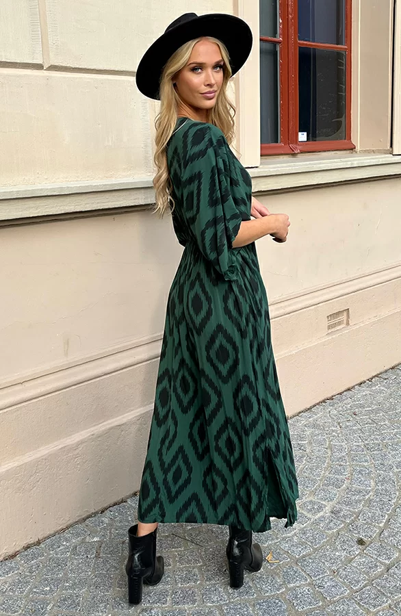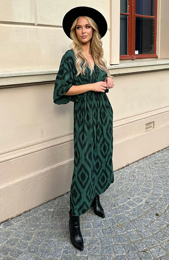 Deze jurk is een echte musthave! De jurk is voorzien van een v-hals en heeft elastiek in de taille.