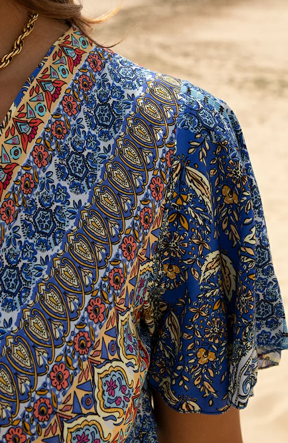 Details: v-hals, korte mouwen en elastiek in de taille Materiaal: 100% Viscose
