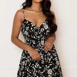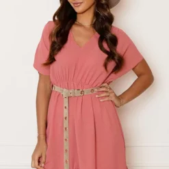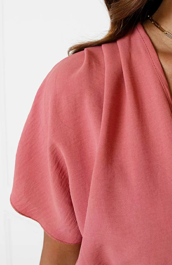 Details: v-hals, korte mouwen, ruches, lint om te strikken, vleermuismouwen en elastiek in de taille Materiaal: 100% Polyester