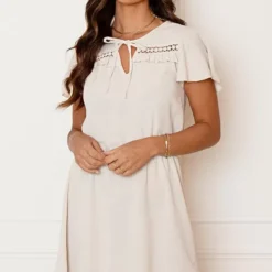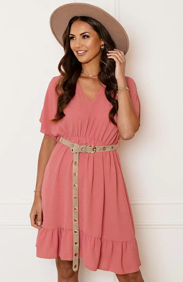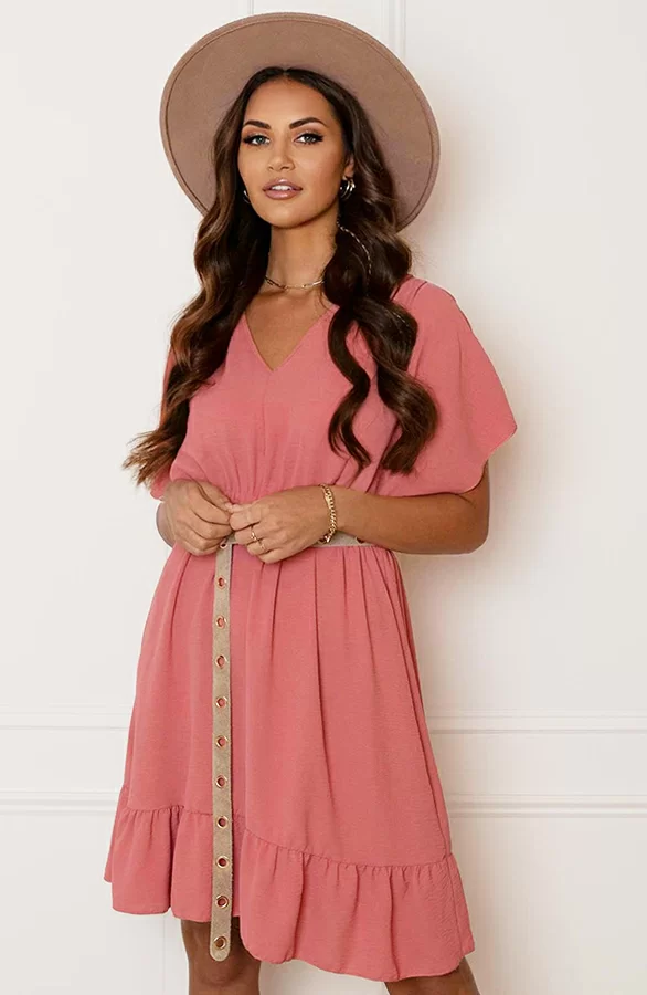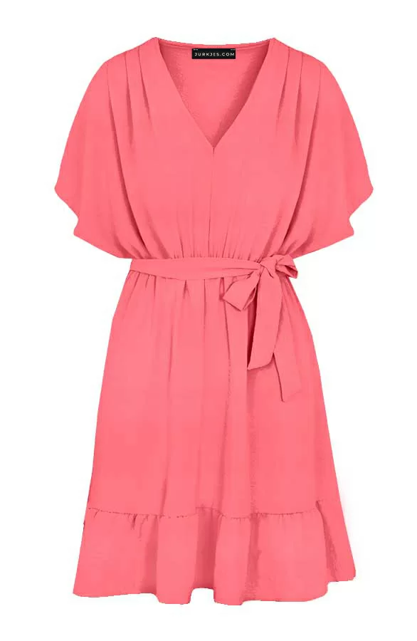 PRETTY! Deze prachtige jurk mag je niet missen! De jurk met ruches is voorzien van korte mouwen en een bijpassend lint om te strikken.