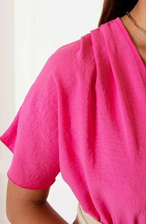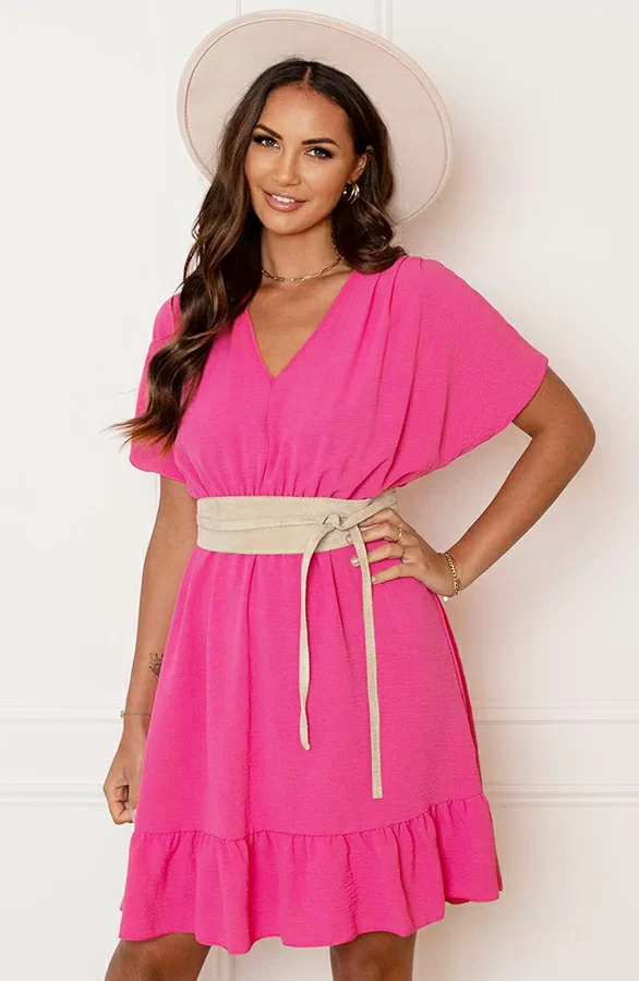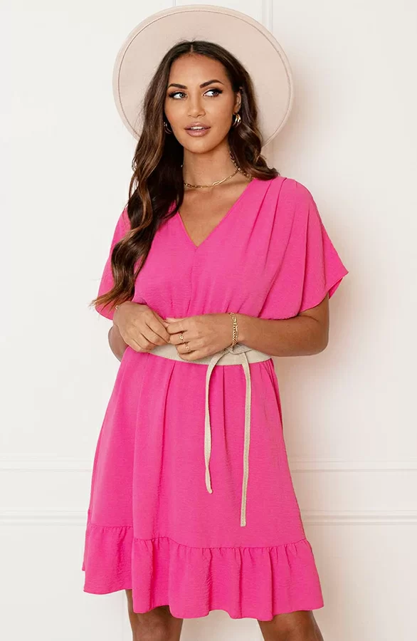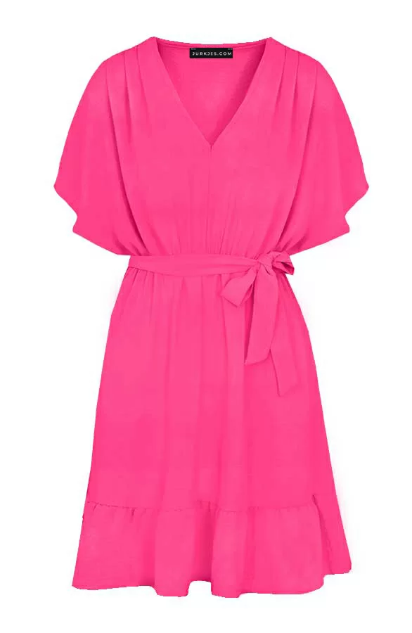 Deze geweldige fuchsia jurk wil je toch hebben?! De jurk is voorzien van korte mouwen, een v-hals en elastiek in de taille.