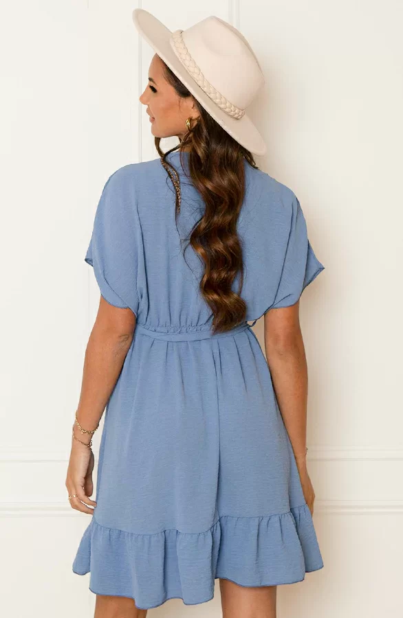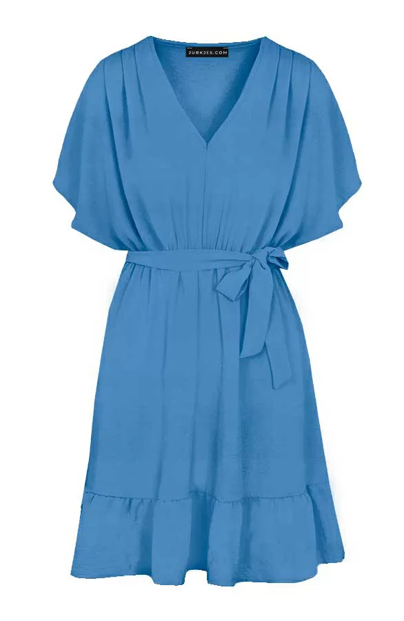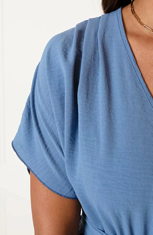 Details: v-hals, korte mouwen, ruches, lint om te strikken, vleermuismouwen en elastiek in de taille Materiaal: 100% Polyester