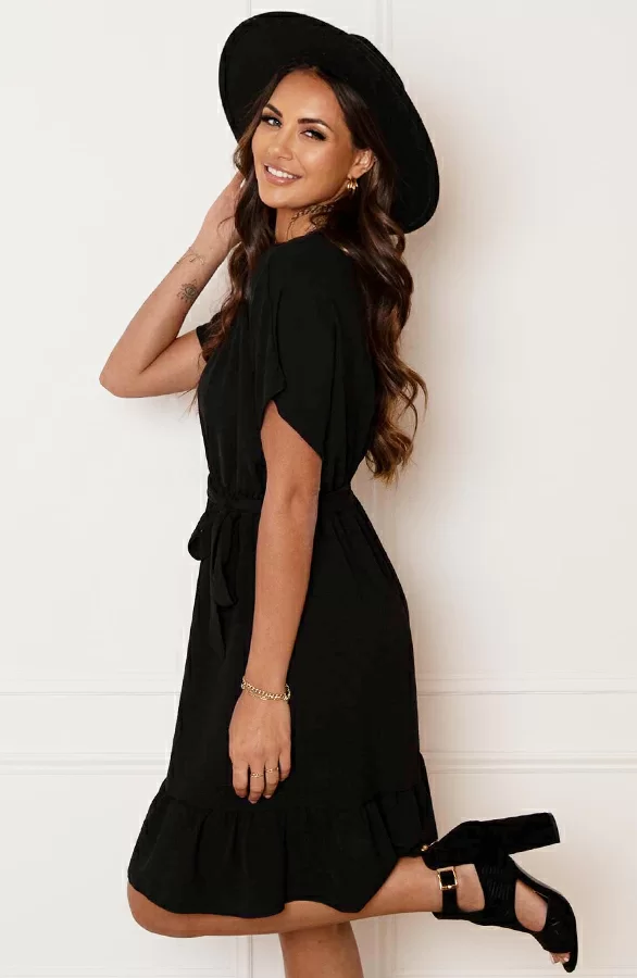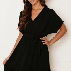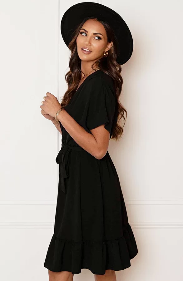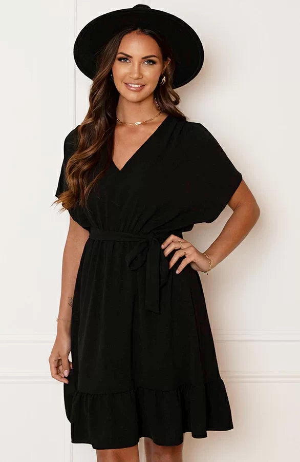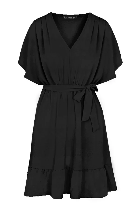 Details: v-hals, korte mouwen, ruches, lint om te strikken, vleermuismouwen en elastiek in de taille Materiaal: 100% Polyester