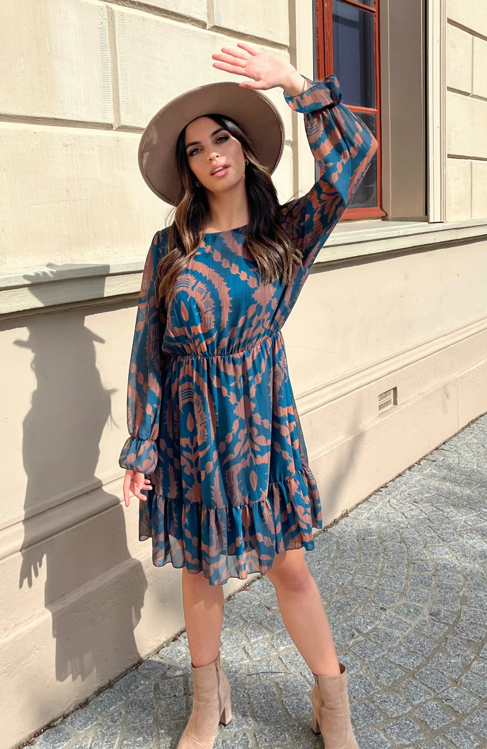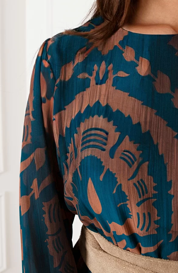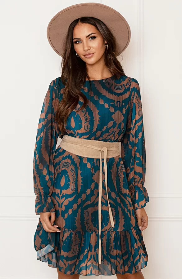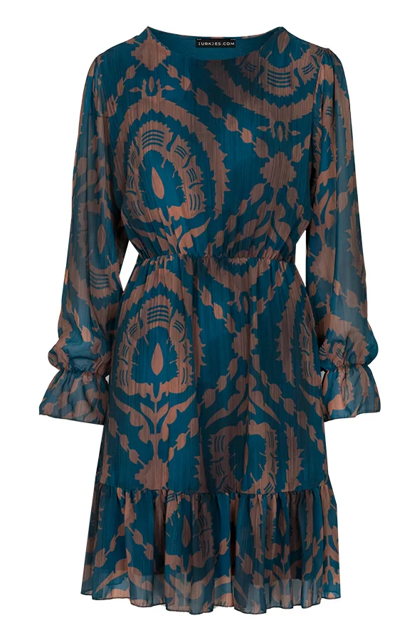 Details: ronde hals, lange mouwen, ruches, onderjurk, elastiek in de taille en elastiek bij de mouwen Materialen: 30% Viscose, 65% Polyester, 5% Elastaan