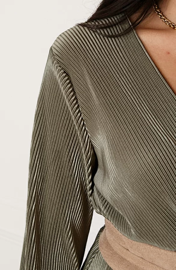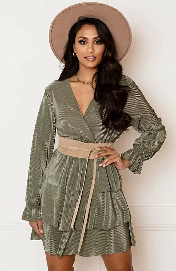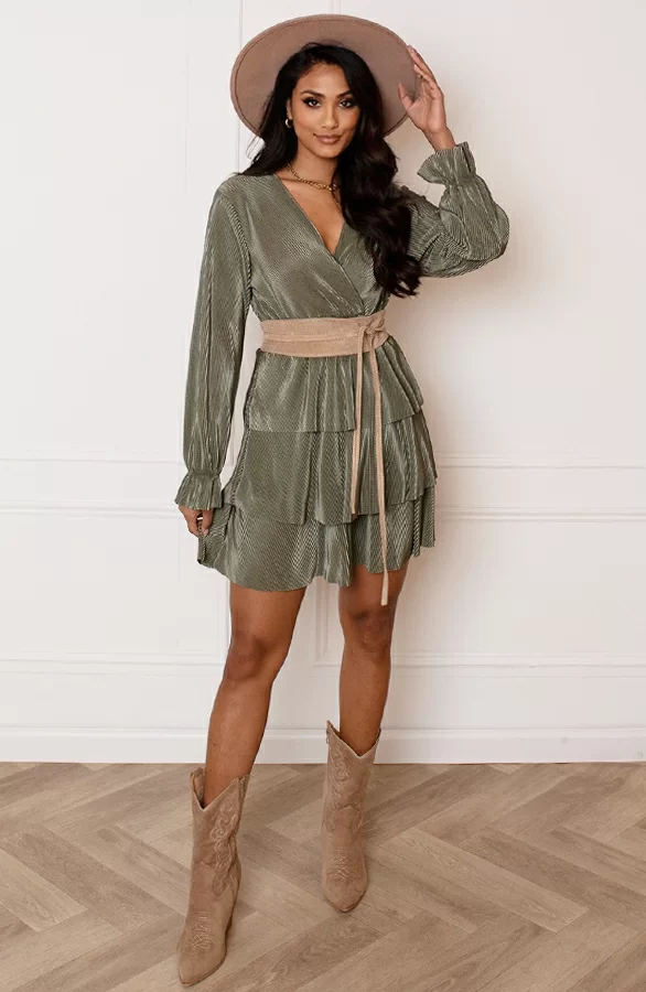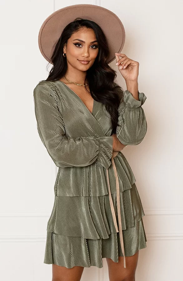 Met deze jurk is het elke dag een feestje! De plisse dress is voorzien van lange mouwen en een v-hals.