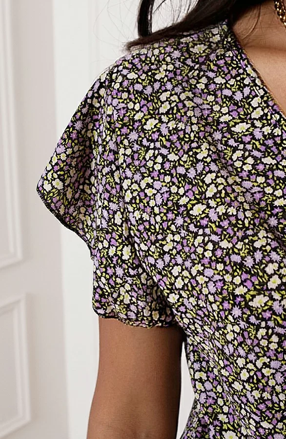 Details: v-hals, korte mouwen, ruches, lint om te strikken en overslag Materiaal: 100% Polyester