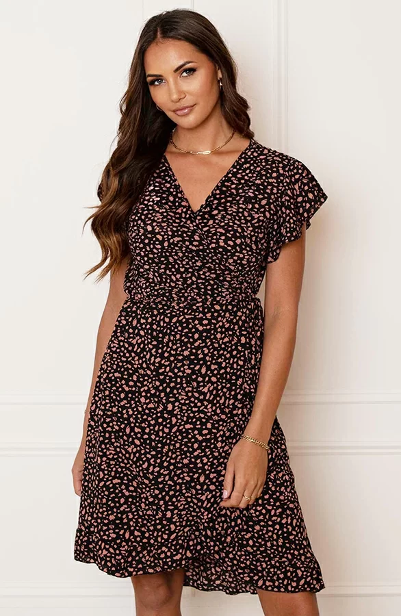 Dit jurkje mag je niet missen! De wikkeljurk is voorzien van korte mouwen en ruches.