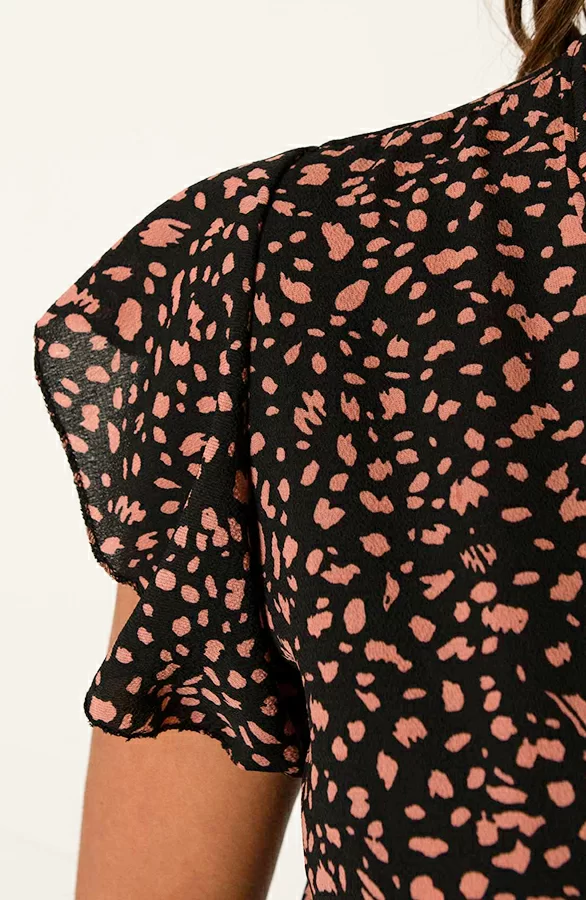 Details: v-hals, korte mouwen, ruches, lint om te strikken, overslag en cheetahprint Materiaal: 100% Polyester