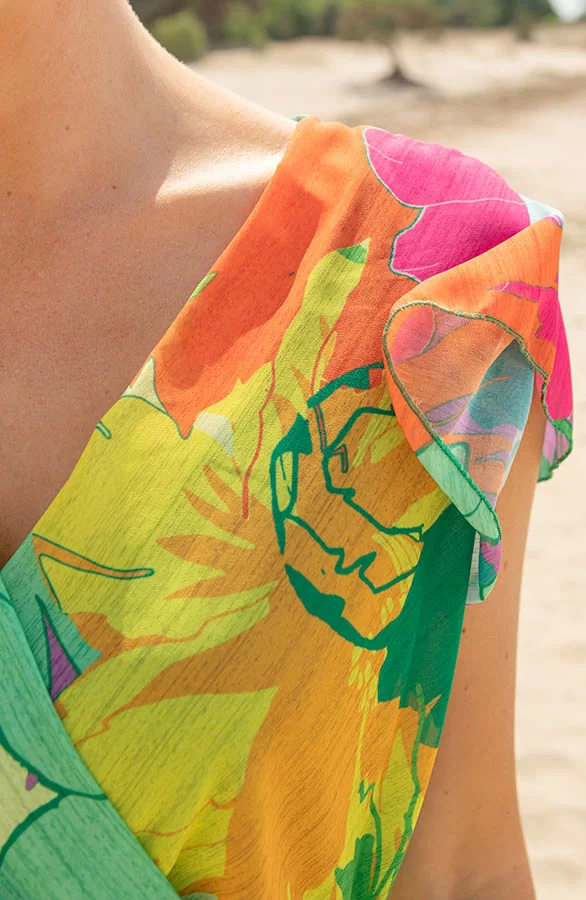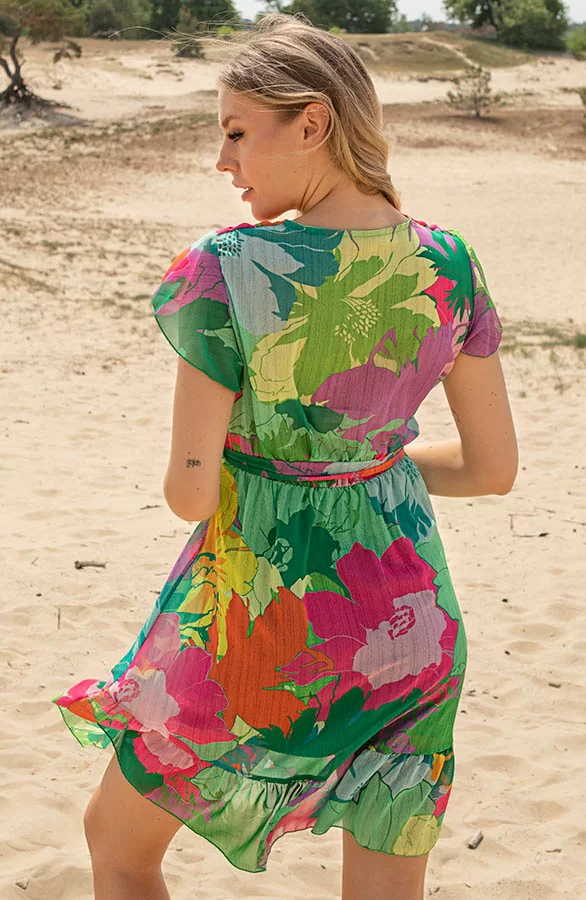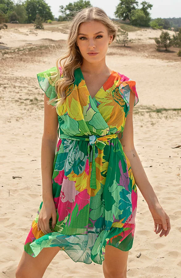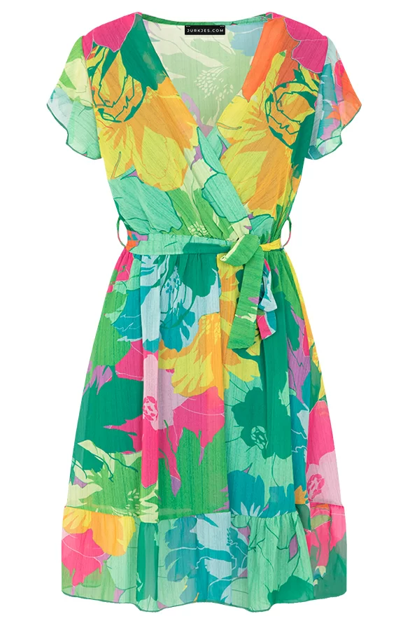 Details: v-hals, korte mouwen, ruches, lint om te strikken, onderjurk, overslag, bloemenprint en elastiek in de taille Materiaal: 100% Polyester