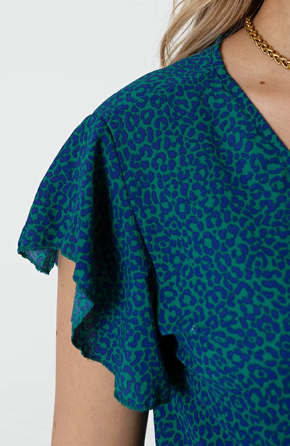 Details: v-hals, korte mouwen, ruches, lint om te strikken, overslag en panterprint Materiaal: 100% Polyester
