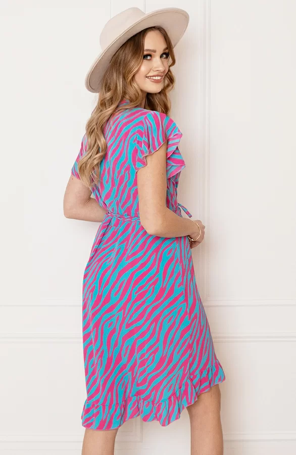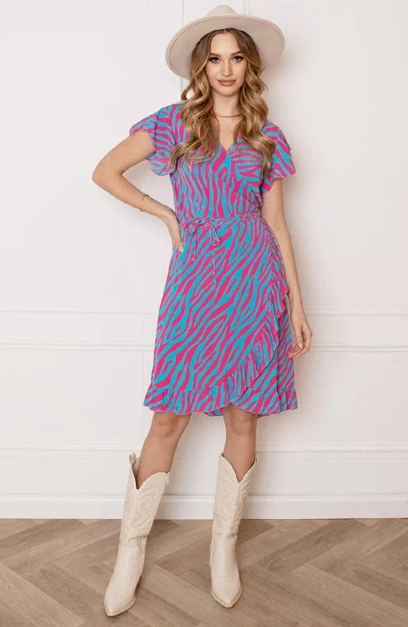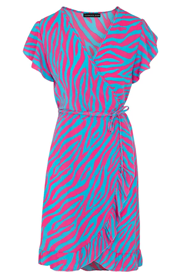 Details: v-hals, korte mouwen, ruches, lint om te strikken, overslag en zebraprint Materiaal: 100% Polyester