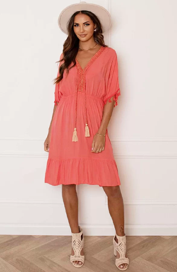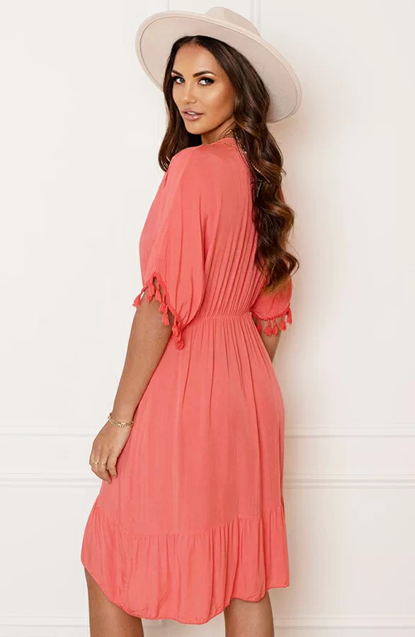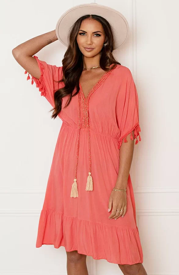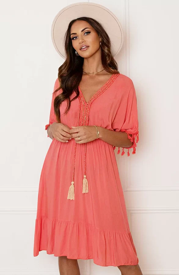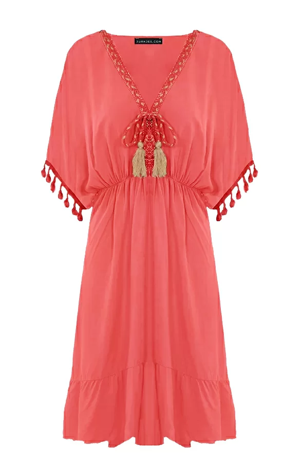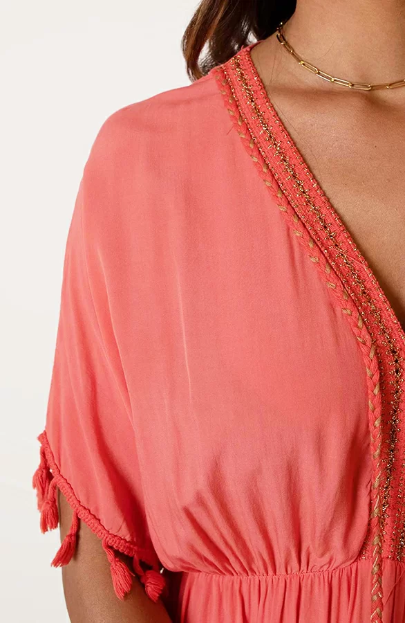 Details: v-hals, korte mouwen, elastiek in de taille, pompons, gevlochten touwtjes en lurex Materiaal: 100% Viscose