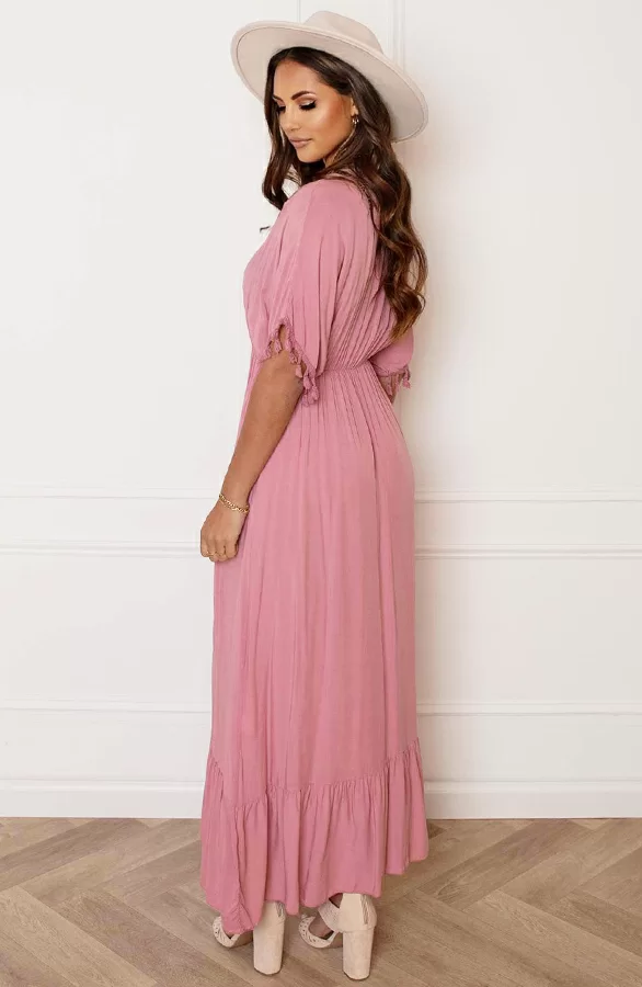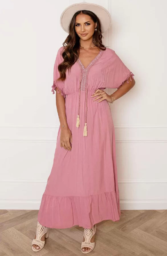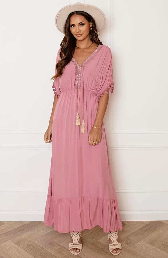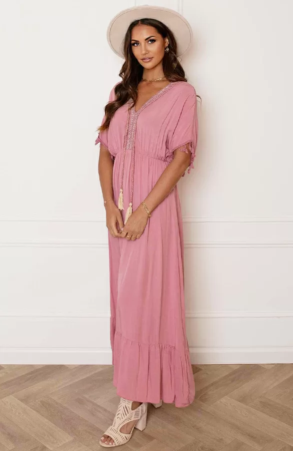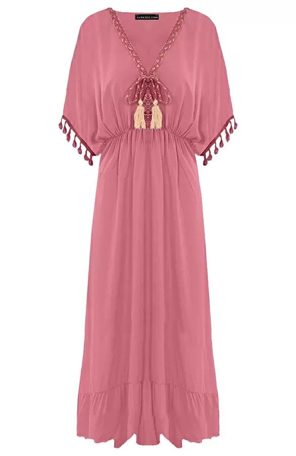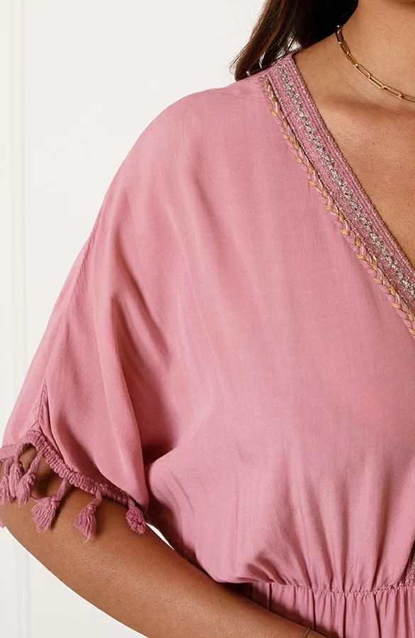 Details: v-hals, korte mouwen, elastiek in de taille, pompons, gevlochten touwtjes en lurex Materiaal: 100% Viscose