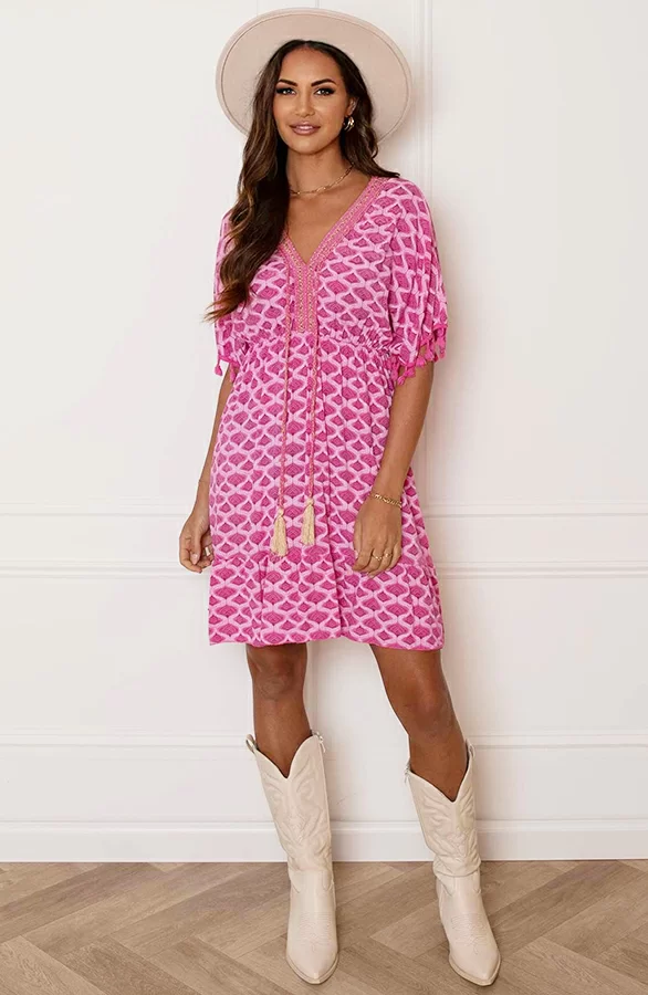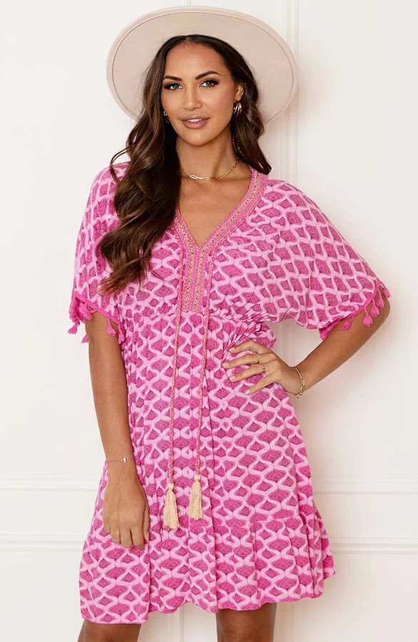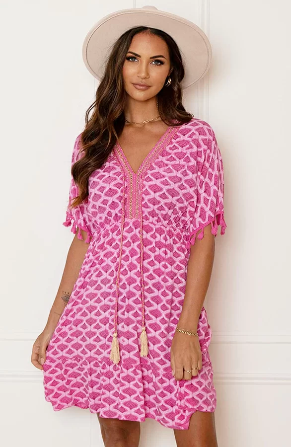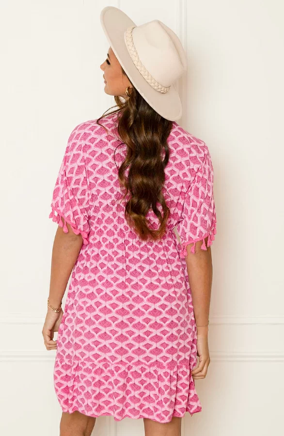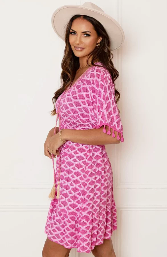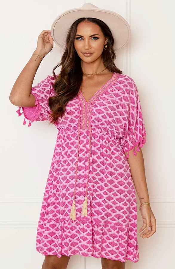 Wauw! Deze prachtige fuchsia jurk is een aanwinst voor jouw garderobe! De oversized jurk is voorzien van gevlochten touwtjes, pompons bij de mouwen en prachtige lurex details.